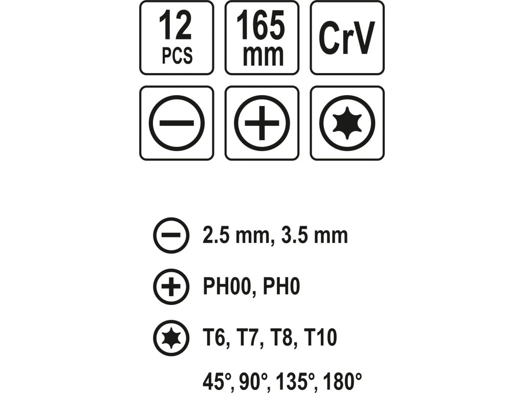 Šroubovák plochý: 2,5; 3,5 mm Šroubovák křížový Ph: Ph00; Ph0 Šroubobvák Torx: T6; T7; T8; T10 Páčidlo: 45°; 90°; 135°; 180°Doplňkové parametry