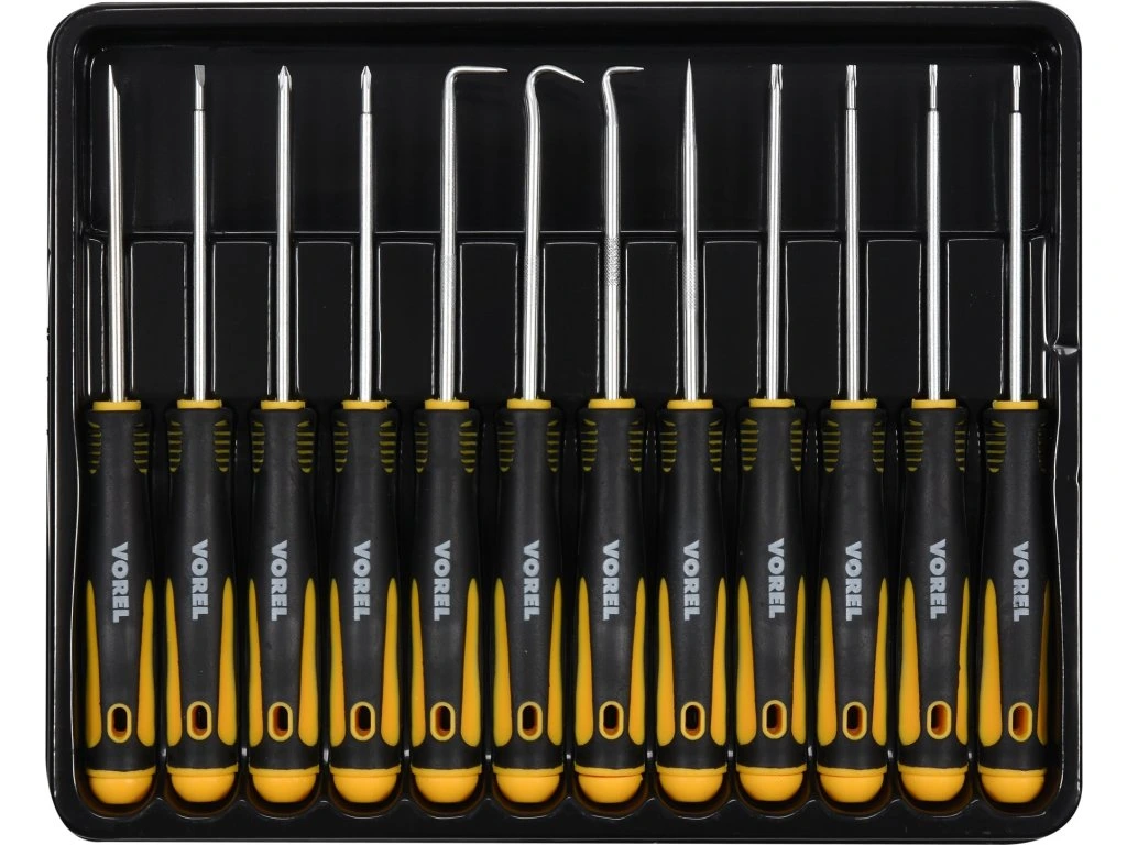 Sada 12 ks šroubováků a háků určených pro jemnou mechaniku a demontáž drobných součástí zařízení.