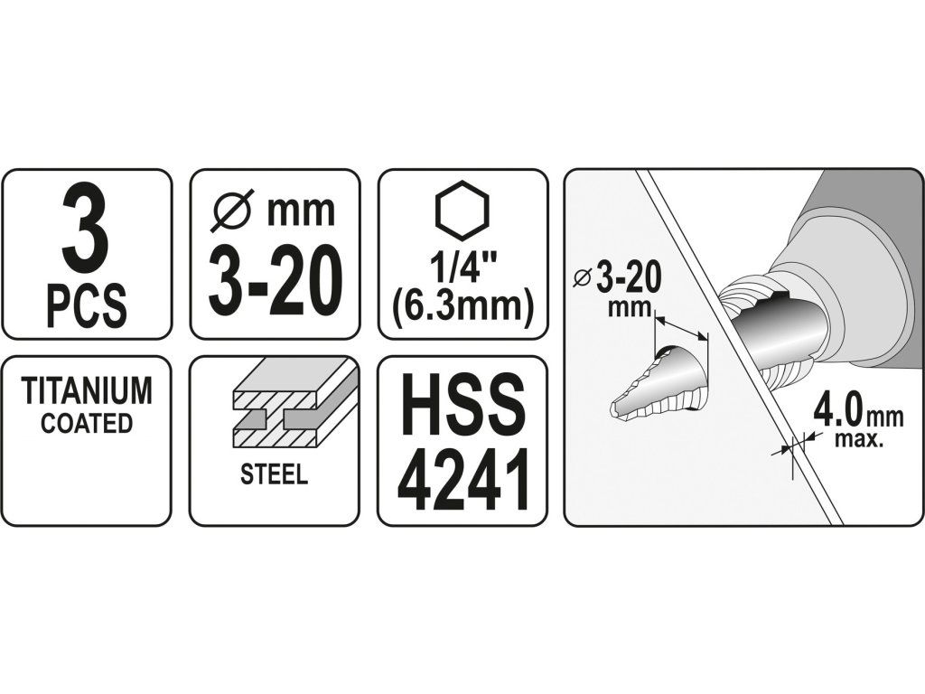 Sada stupňovitých kuželových vrtáků 3-20mm