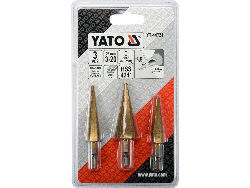 Sada 3 ks stupňovitých kuželových vrtáků na kov umožňující postupné vyvrtání více průměrů otvorů.