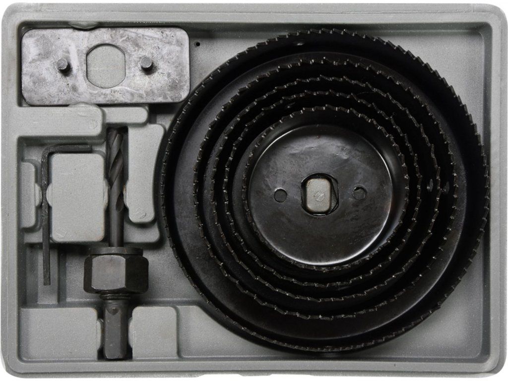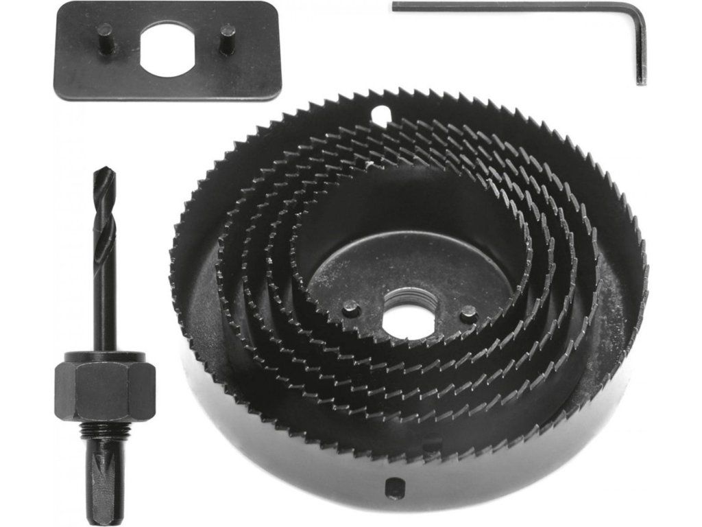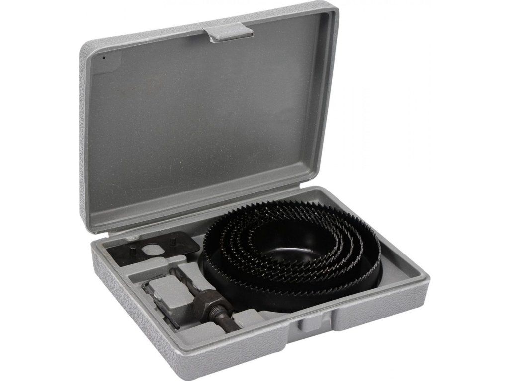 Sada vrtacích korunek do dřeva s průměry 64 - 127 mm.