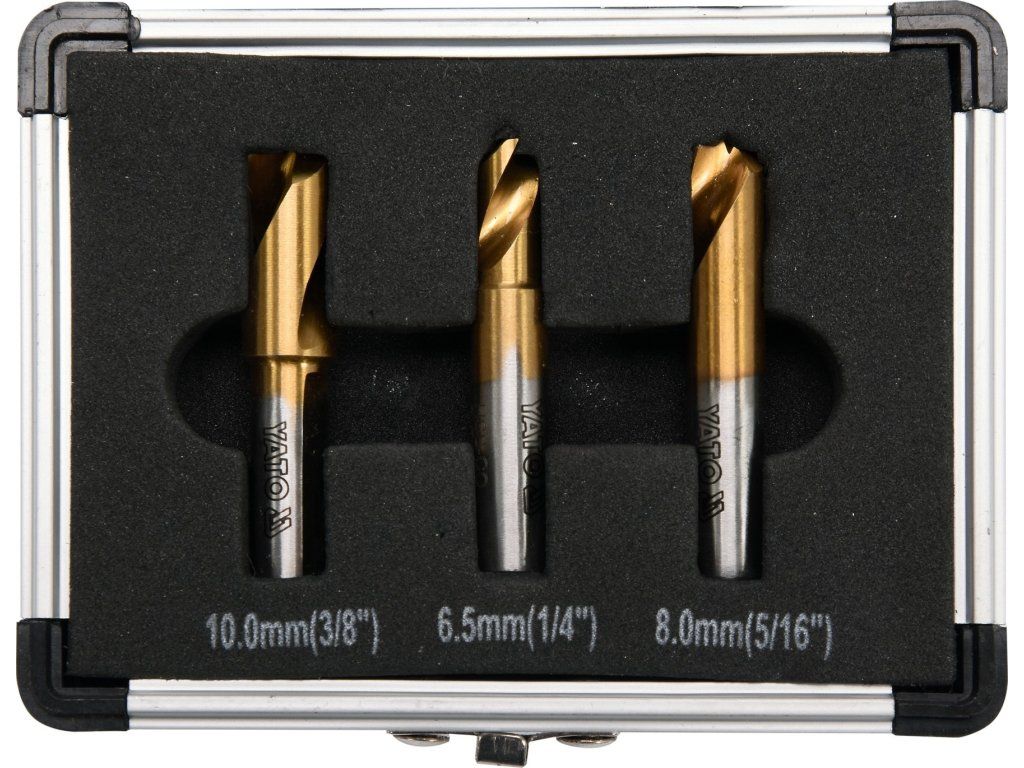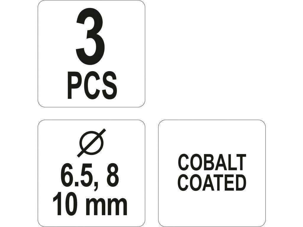 Sada je složena ze tří kusů vrtáků, uložených v pouzdře, s průměry 6,5; 8 a 10 mm.