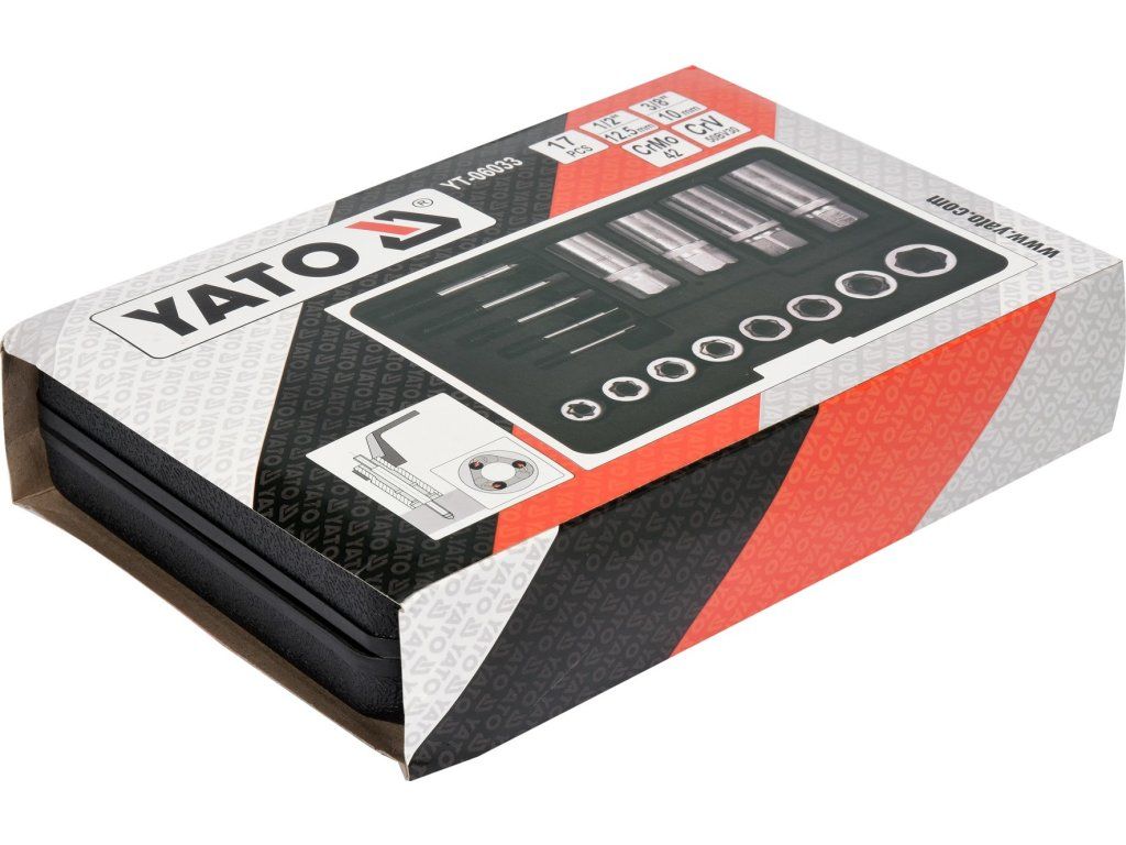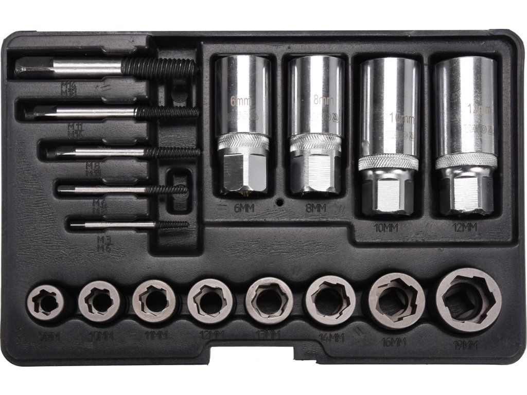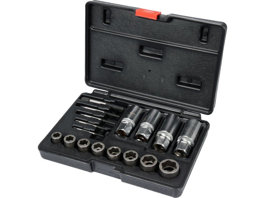 Univerzální 17dílná sada vytahováků šroubů a nástrčných klíčů. Doporučeno pro mechanické a automobilové služby.