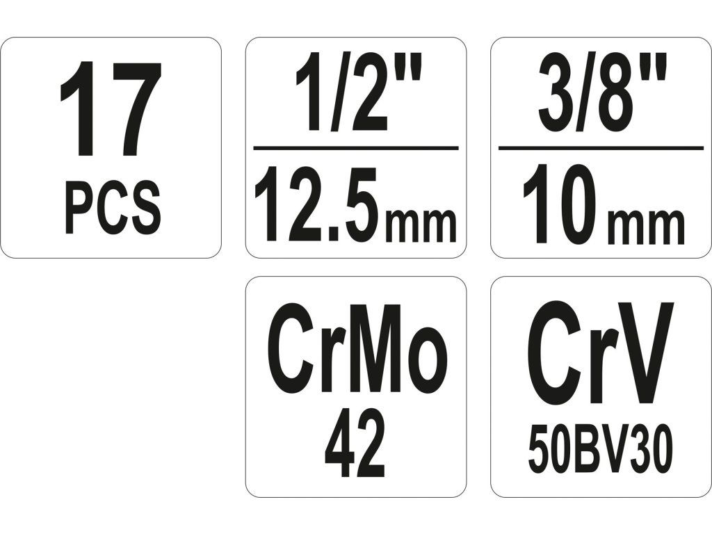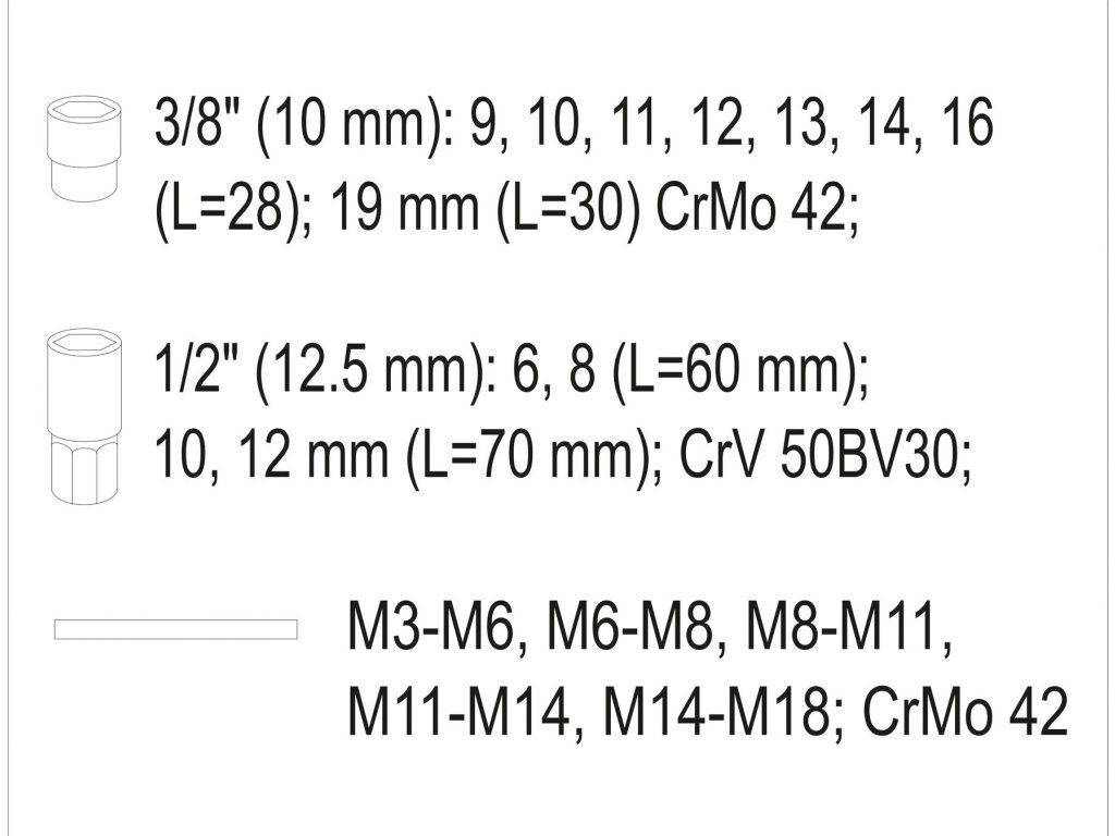 Obsah balení: Nástrčný klíč 3/8": 9, 10, 11, 12, 13, 14, 16 mm (délka 28 mm) Nástrčný klíč 3/8": 19 mm (délka 30 mm) Nástrčný klíč 1/2": 6, 8 mm (délka 60 mm) Nástrčný klíč 1/2": 10, 12 mm (délka 70 mm) Závitník: M3-M6; M6-M8; M8-M11; M11-M14; M14-M18Doplňkové parametry