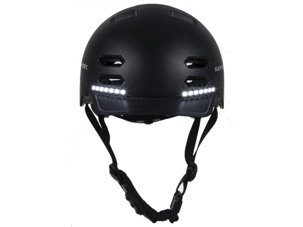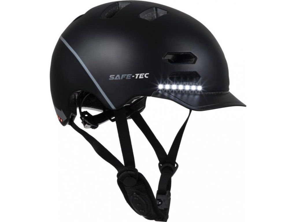 Safe-Tec SK8 BlackChytrá helma pro zvýšení vaší bezpečnosti při sportu. Inovativní řešení přináší zabudované vysoce svítivé přední a zadní LED světla. Spínačem na zadní straně přilby volíte požadovaný režim světel. Vestavěné stereo reproduktory využívají přenos zvuku po kosti a umožní tak poslech hudby bez krytí okolního ruchu. V popruhu pod bradou je umístěný mikrofon pro bezpečné vyřízení hovorů. Helmu spojíte s vaším mobilním telefonem bezdrátově díky Bluetooth. Fidlock magnetické zapínání umožňuje rychlé sundání a nasazení helmy. Nabíjení integrované baterie je realizováno skrze USB-C konektor.