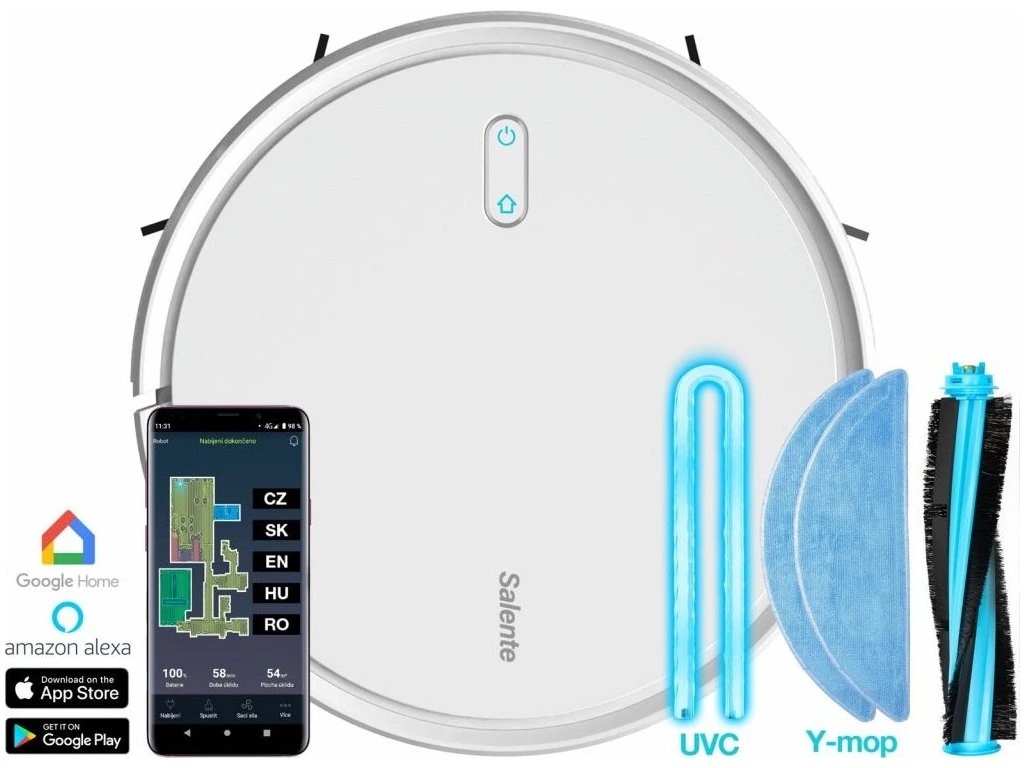 Salente G4 je schopen vaši podlahu vysávat, vytírat a desinfikovat pomocí vestavěné UVC lampy současně. Pomocí SMART gyroskopické navigace a snadné kontroly uklízeného prostoru pomocí mobilní aplikace v českém jazyce dokáže snadno, rychle a kvalitně uklidit váš členitý byt nebo dům a po ukončení úklidu se vrátit zpět do nabíjecí základny.