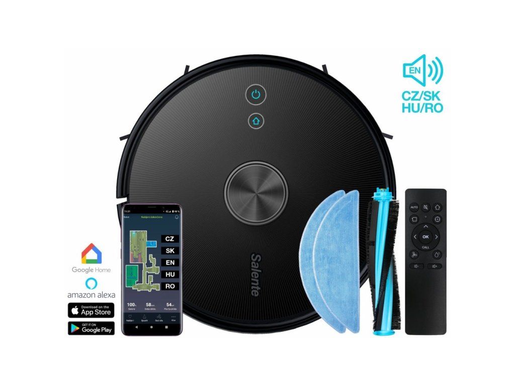 Aplikace Salente umožňuje ovládat vysavač mobilním telefonem nebo tabletem na dálku. Informuje vás o aktuálním stavu vysavače, můžete spustit různé režimy úklidu nebo nastavit úrovně vysávání nebo vytírání. Aplikace je v českém jazyce a je určena pro operační systémy Android a iOS. Pokud nejste fanouškem mobilních aplikací, můžete vysavač ovládat i pomocí přiloženého dálkového ovladače nebo tlačítky na vysavači.
