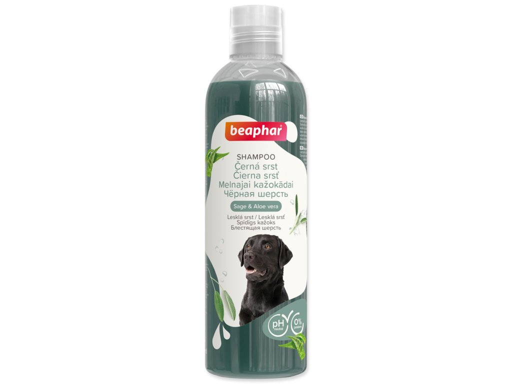 Beaphar šampon na černou srst je jemný pH neutrální šampon speciálně vyvinutý pro černé a tmavě zbarvené psy. Šampon je obohacen o šalvěj a aloe vera, udržuje srst jemnou a lesklou a podporuje její přirozenou tmavou barvu. Váš pes bude vonět čistotou a svěžestí.