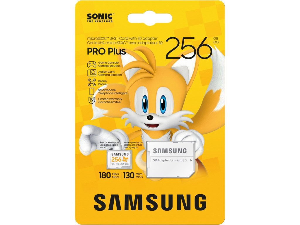 Paměťová karta Samsung PRO Plus Sonic the Hedgehog, která je rychlá stejně jako modrý kulový blesk. Jedná se oficiálně licencovaný produkt, který potěší všechny fanoušky kultovního ježka Sonica. Disponuje kapacitou 256 GB a nabízí tak obří prostor pro všechna vaše multimédia. Umožní vám bez kompromisů uložit hry, filmy, videa i fotografie ve vysokém rozlišení a vaše multimediální knihovna může dlouhodobě růst.