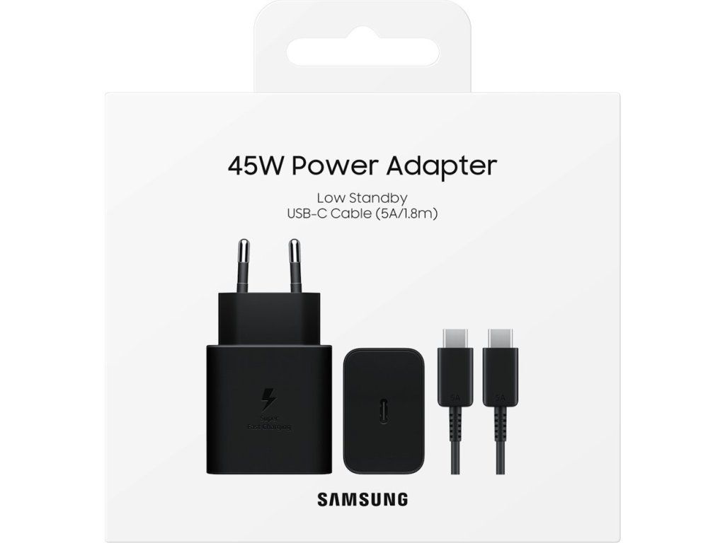 Samsung cestovní nabíječka do sítě s maximálním výkonem 45W, USB-C výstupem a USB-C kabelem dlouhým 1,8m.