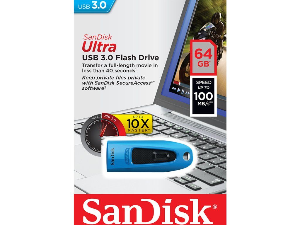 SanDisk Ultra USB 3.0 Flash Drive kombinuje rychlejší přenos dat a velkorysou kapacitu v kompaktním, stylovém balení.