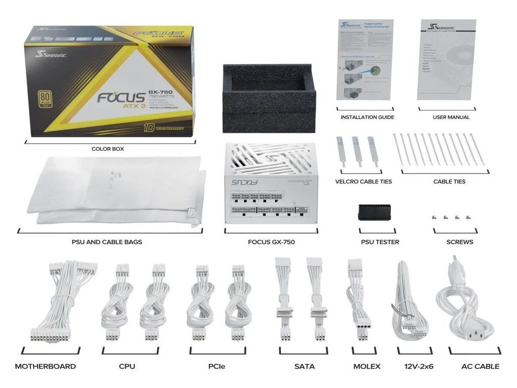 Seasonic FOCUS GX-750 bílýNapájecí zdroj o výkonu 750 W nabízí tichý chod, aktivní PFC a 135 mm velký ventilátor s FDB ložiskem. Zdroj splňuje certifikaci 80PLUS Gold a má plně odpojitelné kabely. Zdroj odpovídá specifikaci ATX 3.1 a PCIe 5.1.