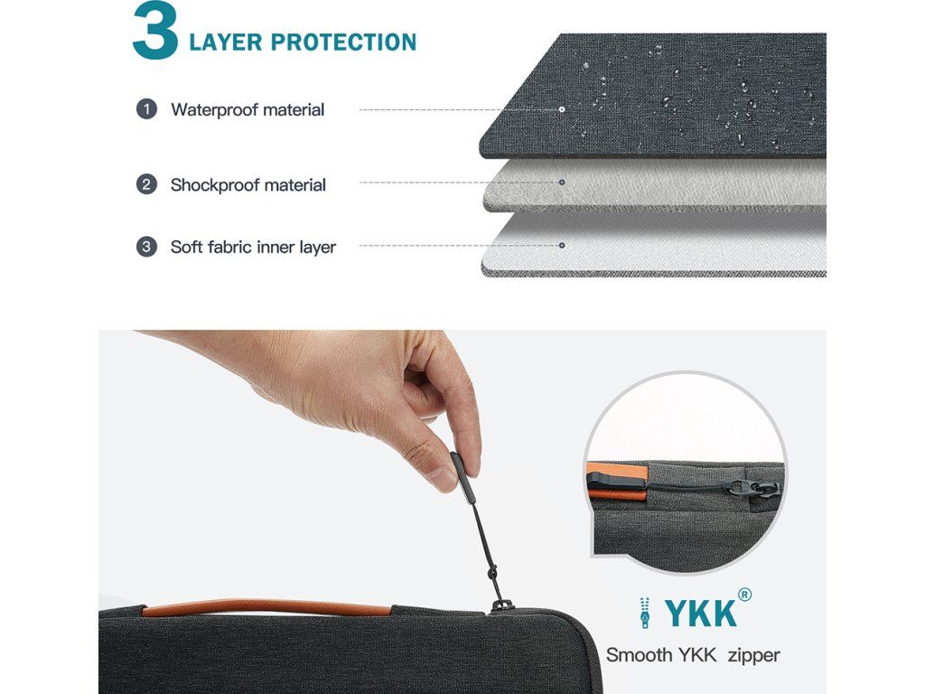 Taška je vyrobena ze tří vrstev textilie - vnější voděodolný materiál, který odolá cákancům vody, střední nárazu vzdorný materiál a vnitřní měkký materiál. Díky těmto třem textiliím máte jistotu, že je vaše zařízení v bezpečí za všech okolností. Rohy brašny jsou navíc opatřeny ochranou rohů zařízení.