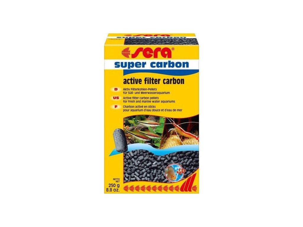 Sera Sper Carbon je aktivní uhlí, které působí jako filtrační médium. Absorbuje jedovaté látky a barviva z akvarijní vody rychle a spolehlivě. Žluté zbarvení vody zmizí a voda bude zase křišťálově čistá. Aktivní uhlí neobsahuje fosfáty ani nitráty a neovlivňuje hodnotu pH. Sera super carbon zůstává díky své velké ploše aktivní po dobu šesti týdnů. Preparát je určen pro filtraci sladké a slané vody.