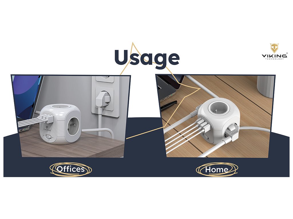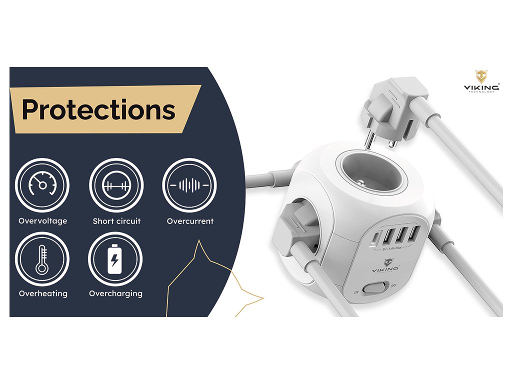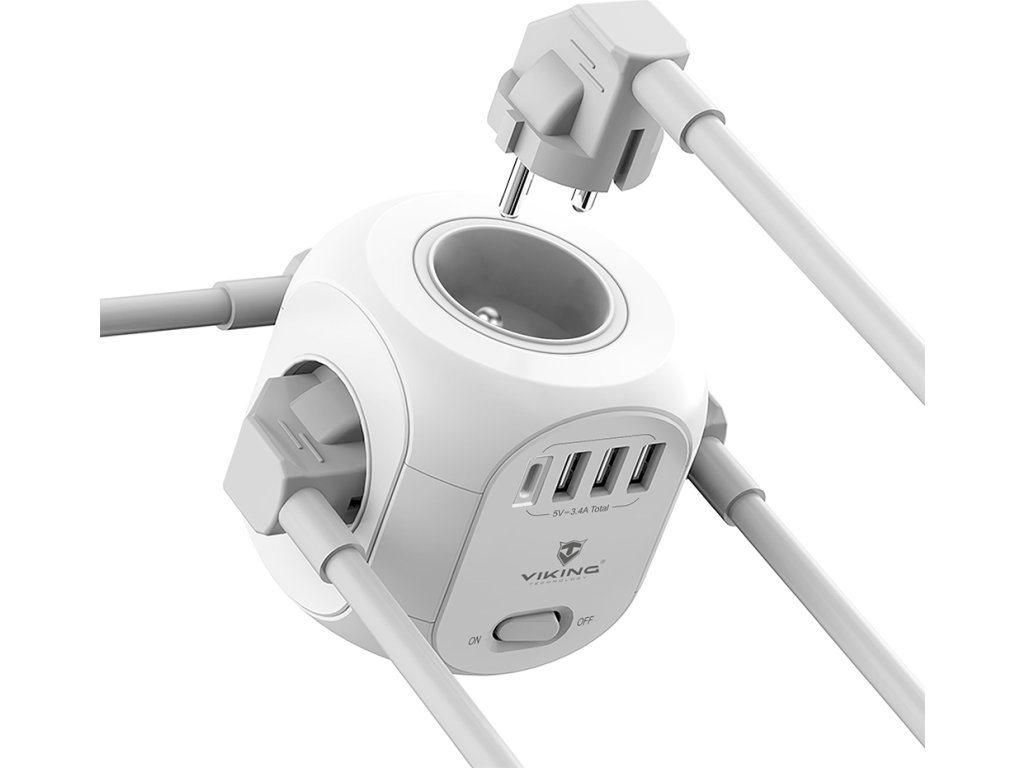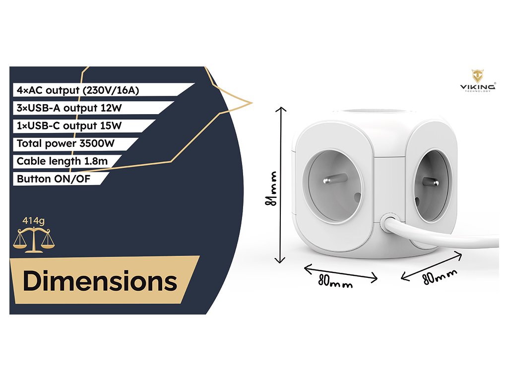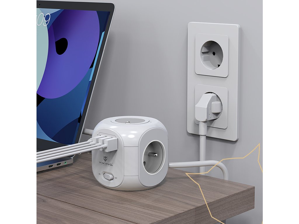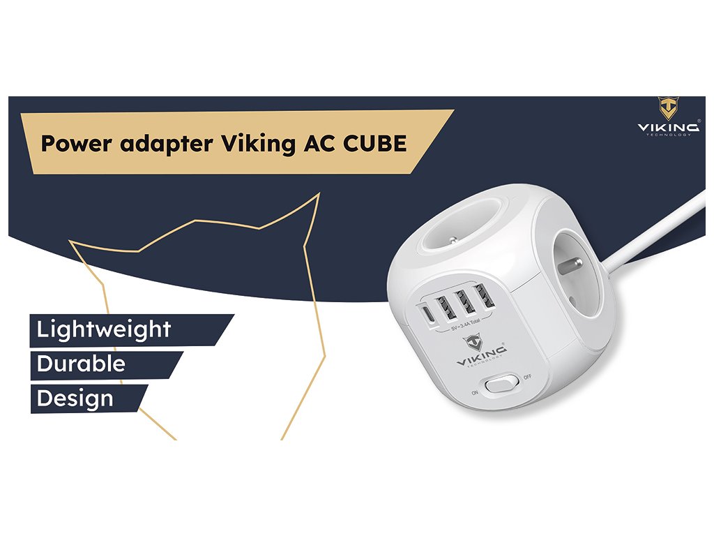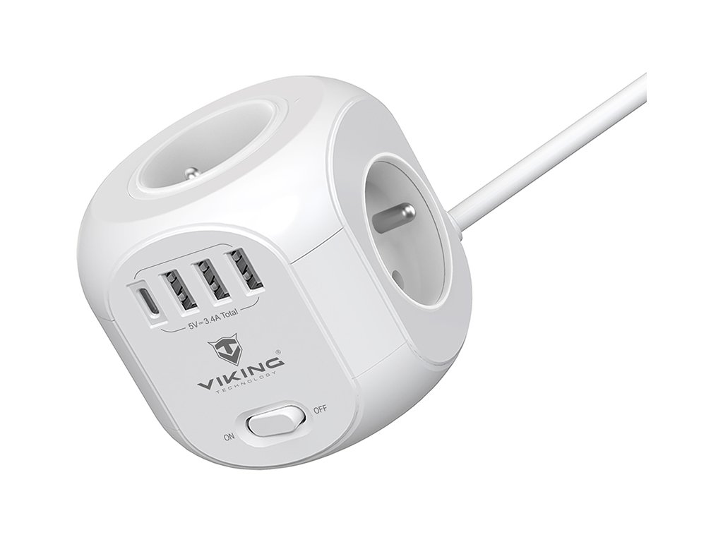 Síťový adaptér Viking AC Cube/Output:4xAC,3xUSB-A,1xUSB-C/Tlačítko ON/OFF/zásuvka typu E