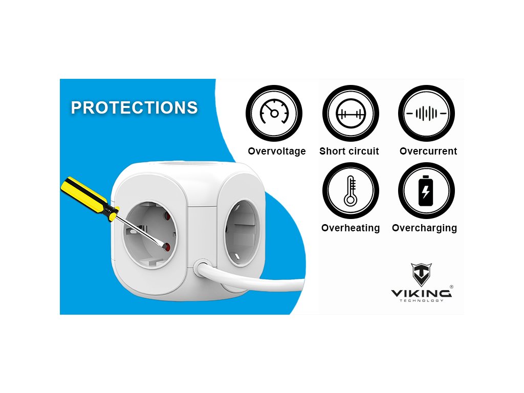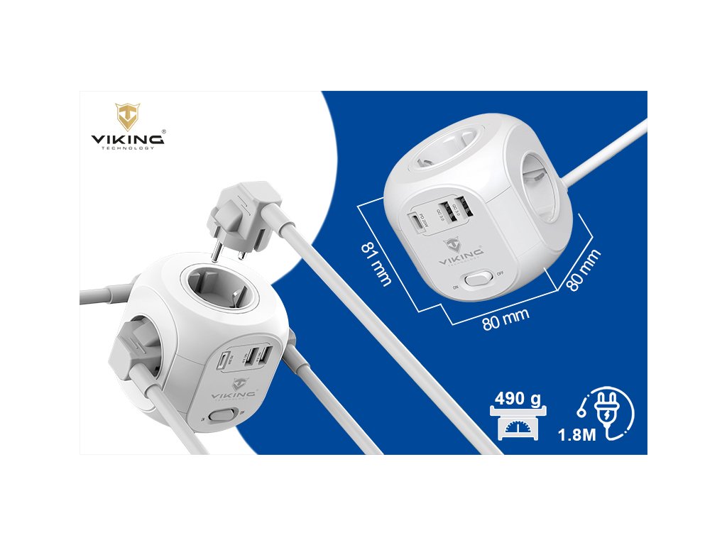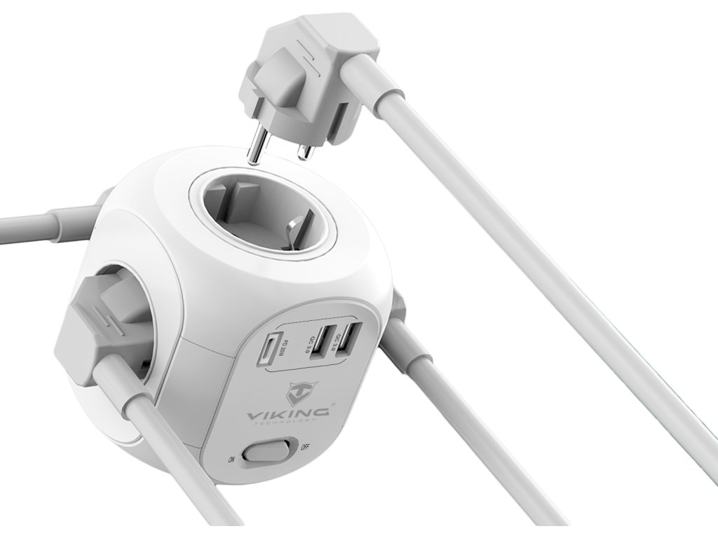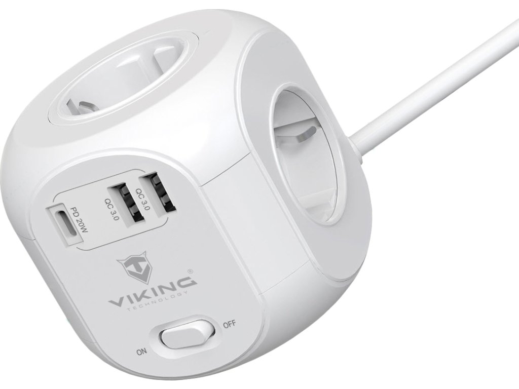 Síťový adaptér Viking AC Cube PD/Output:4xAC,2xUSB-A,1xUSB-C/Tlačítko ON/OFF/zásuvka typu F