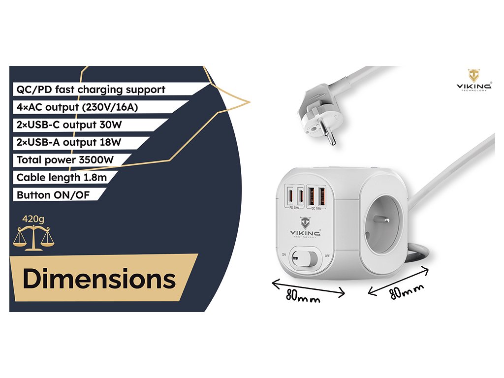 Viking AC CUBE PD30 kombinuje čtyři USB porty (2× USB-C, 2× USB-A), čtyři síťové zásuvky a 1,8m prodlužovací kabel v jednom elegantním a prostorově úsporném zařízení. Umožňuje současně napájet až osm spotřebičů nebo elektroniky, aniž by zbytečně zabíral místo na pracovním stole.