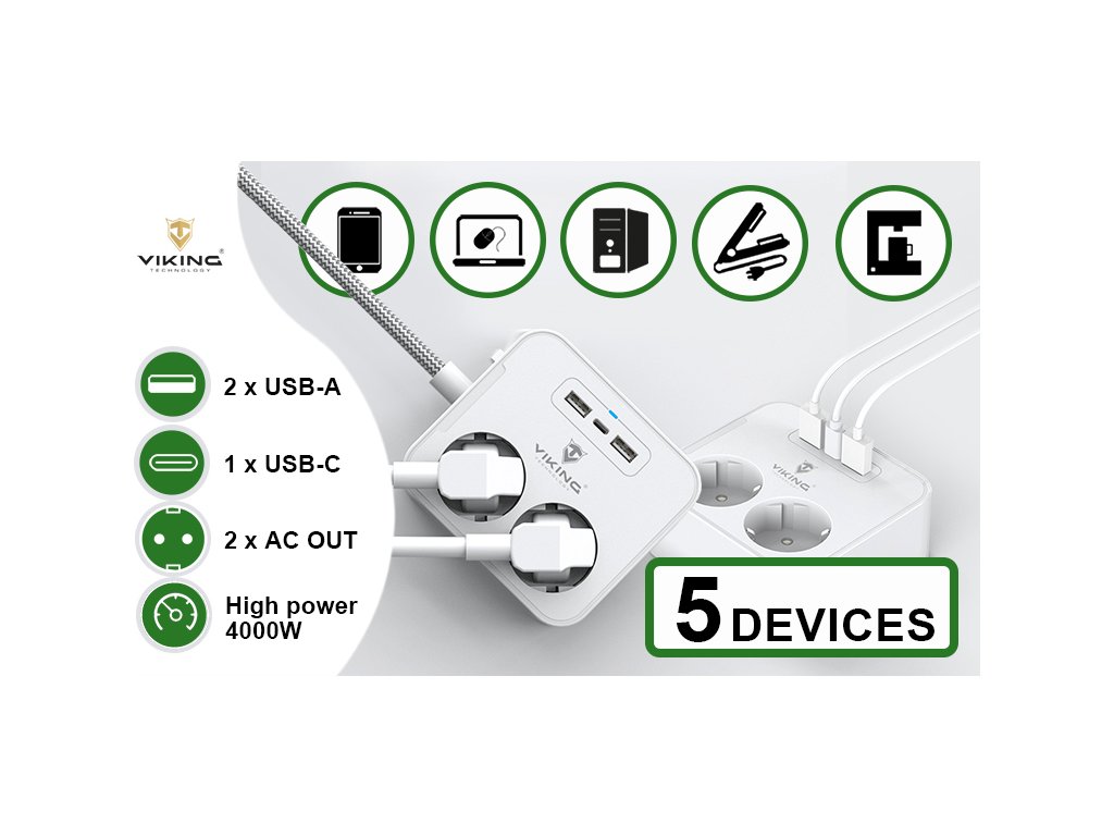 Představujeme spolehlivý rozbočovač Viking AC23, který překoná vaše očekávání. S dvěma AC výstupy o výkonu 250V/16A (max. 4000W), dvěma rychlými USB-A výstupy (5V/2.4A) a jedním rychlým USB-C výstupem (5V/3A) přinášíme do vašeho života maximální efektivitu a pohodlí.