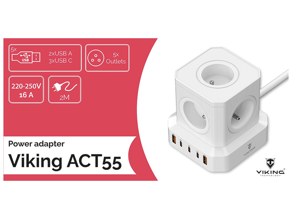 Viking ACT55 kombinuje pět výkonných USB portů (3× USB-C a 2x USB-A), pět AC zásuvek a 2m prodlužovací kabel v jednom kompaktním zařízení, které umožňuje současné napájení až 10 zařízení.