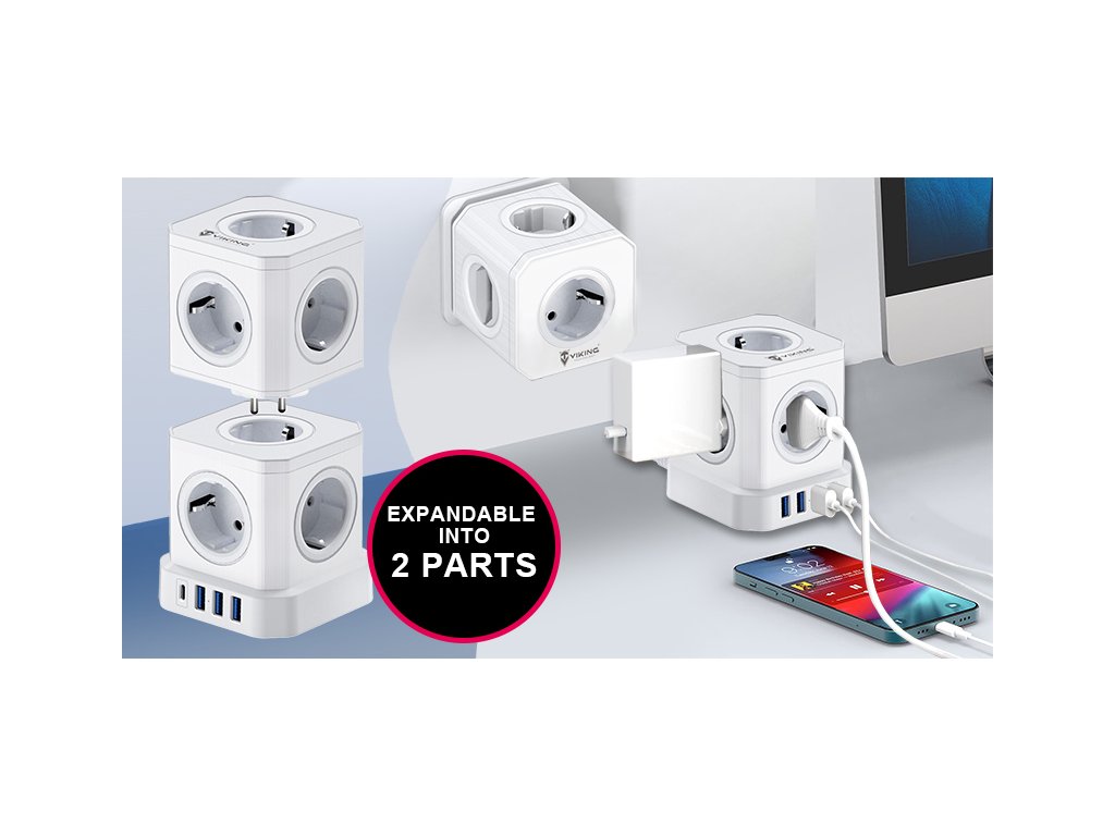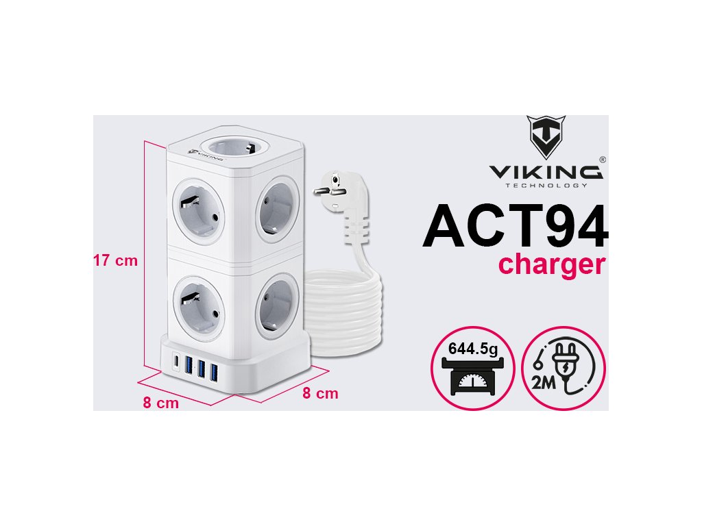 Představujeme Viking ACT94 - revoluční elektrickou zásuvku, která rozšiřuje standardní zásuvku na dalších 9 x AC 230V, 3 x USB-A a 1x USB-C výstupů.