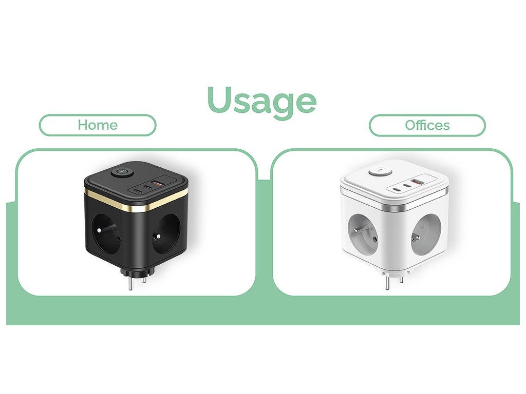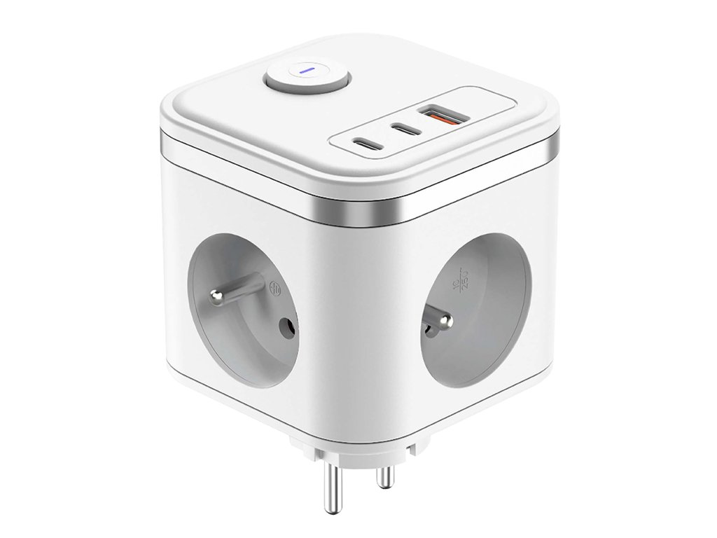 Síťový adaptér • rozbočovač • zásuvka • 3 x AC (230V) výstup • 1 x USB-A (5V 3A, 9V 2A, 12V 1,5A) • 2 x USB-C (5V 3A, 9V 2,22A, 12V 1,67A) • kompaktní rozměry a design • tlačítko ON/OFF • možnost nabíjení až 6 zařízení současně