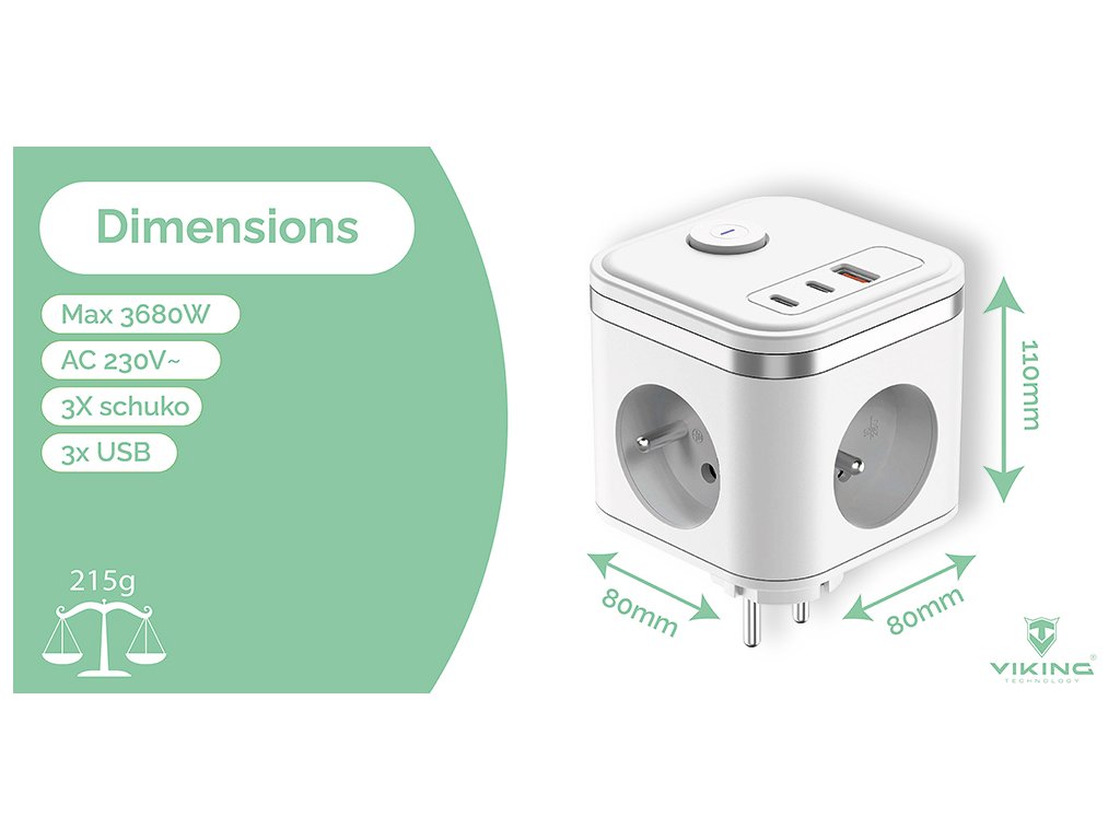 Síťový adaptér VIKING Y33 kombinuje 3 AC výstupy a 3 USB porty, což umožňuje nabíjení až 6 zařízení současně. Díky kompaktnímu designu a tlačítku ON/OFF je používání snadné a přehledné.