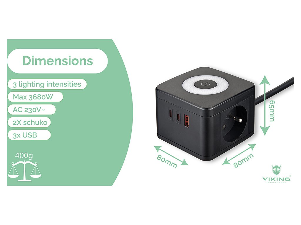 Síťový adaptér VIKING YC23L nabízí pohodlné a efektivní napájení vašich zařízení díky 2 AC výstupům a 3 USB portům, umožňujícím nabíjení až 5 zařízení současně. S dotykovým světlem se třemi intenzitami svícení a kompaktním designem je ideální pro domácnost i kancelář.