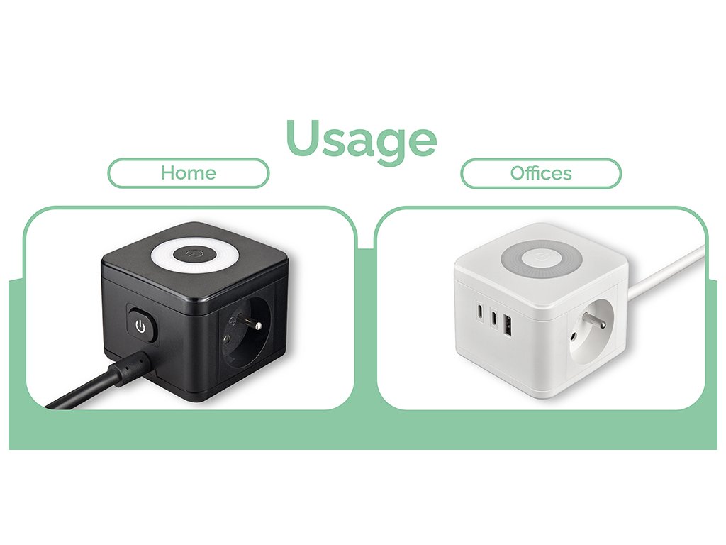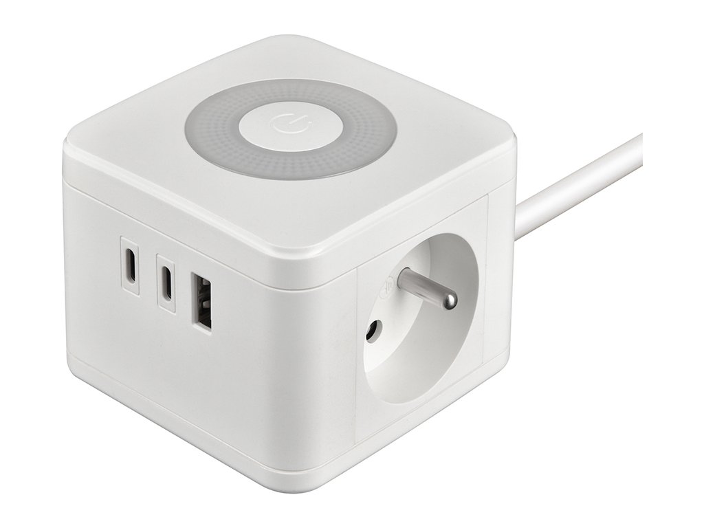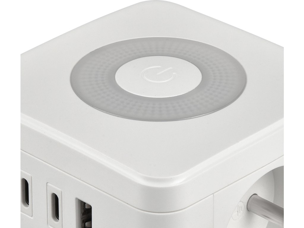 Síťový adaptér • rozbočovač • zásuvka • 2 x AC (230V) výstup • 1 x USB-A (5V/3A) • 2 x USB-C (5V/3A) • dotykové světlo se třemi intenzitami svícení • kompaktní rozměry a design • kabel 1,4 m • možnost nabíjení až 5 zařízení současně