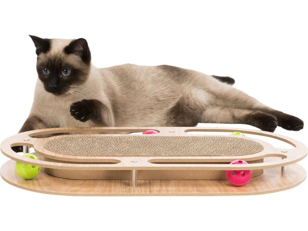 Škrábací karton v dřevěném rámu, s catnipem a hračkami, 45x4x25cm