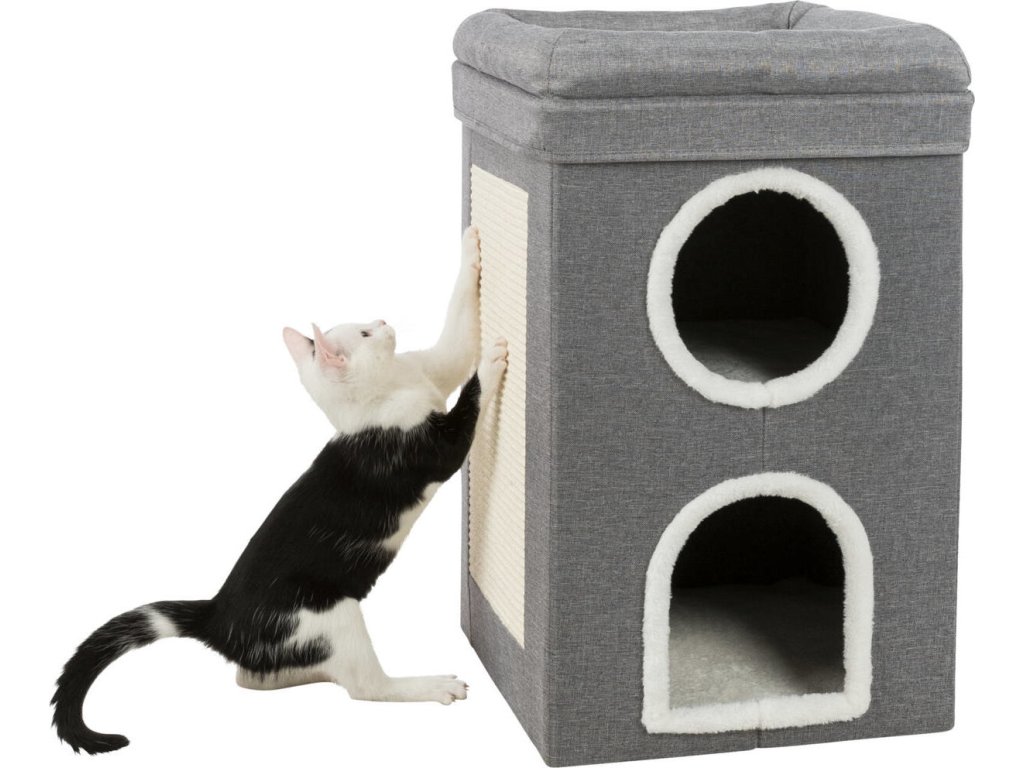 Škrábadlo SAUL, čtvercová věž, 2 jeskyňky, 39x39x64cm, šedá/bílá