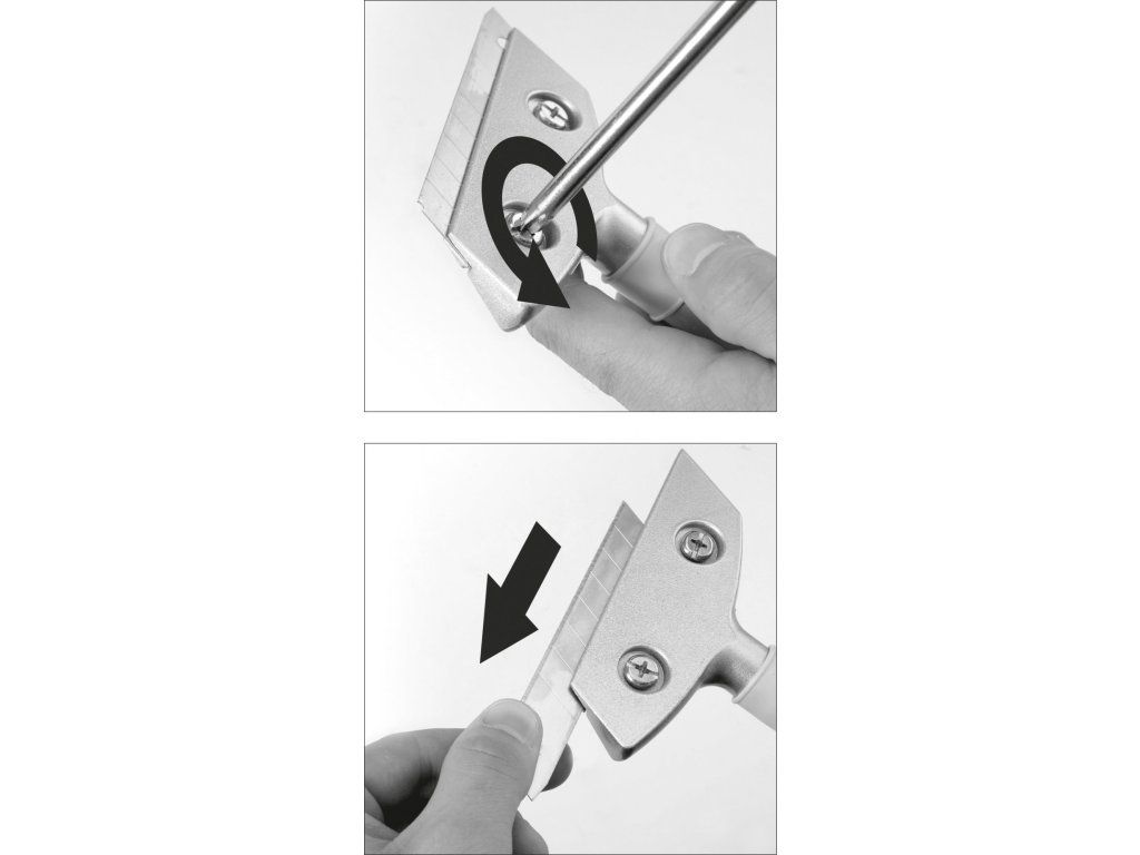 Škrabka s vyměnitelnou čepelí, rozměry 18 x 100 mm, vhodná pro typické lomené čepele nože namontované na držáku z hliníku.