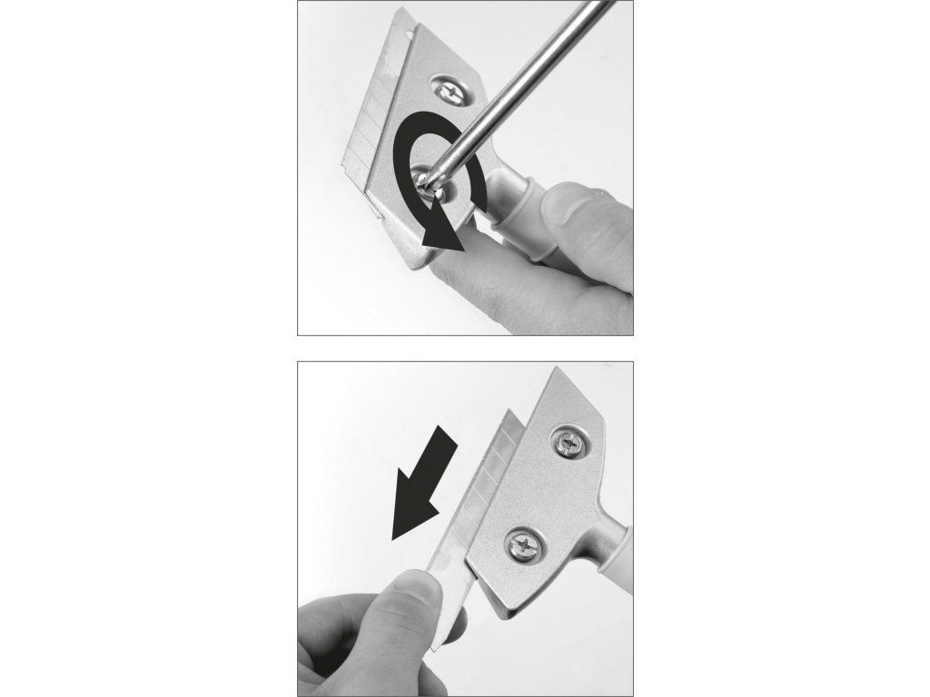 Teleskopická škrabka s vyměnitelnou čepelí, rozměry 18 x 100 mm, vhodná pro typické lomené čepele nože namontované na držáku z hliníku.