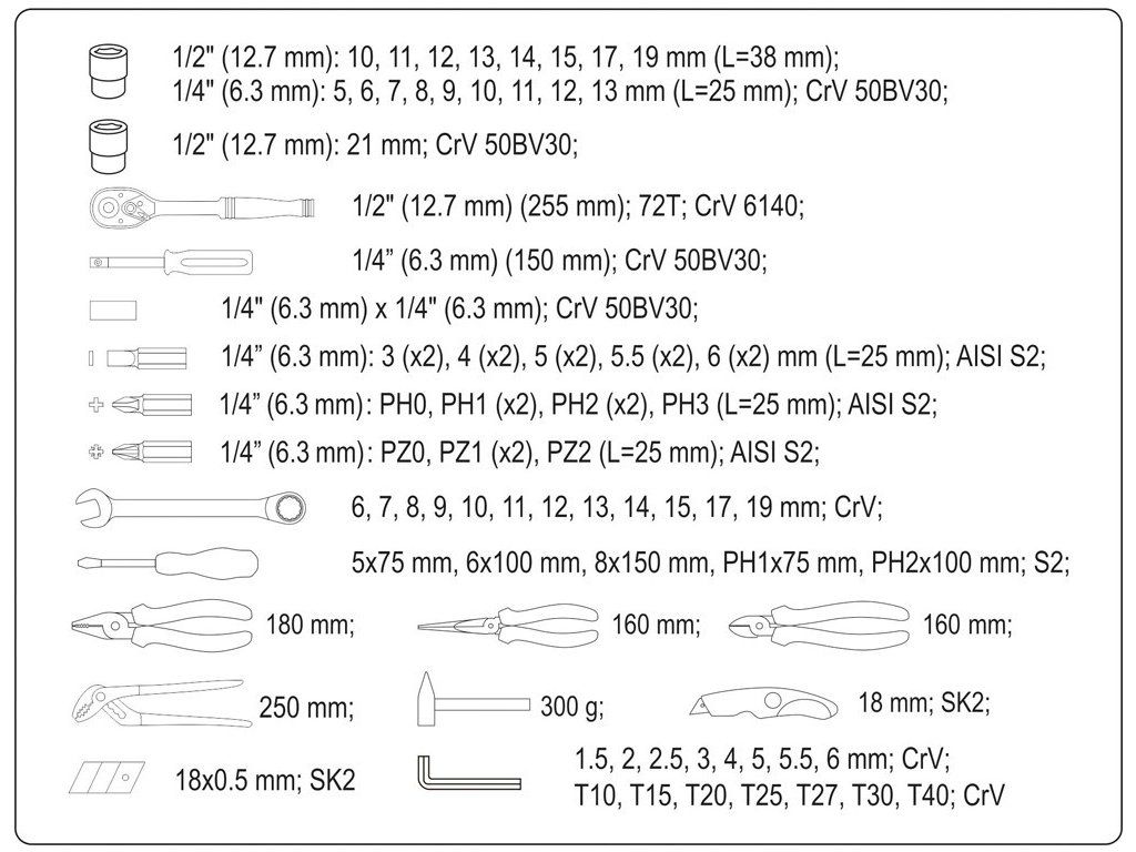 • Sadu stranových klíčů 6, 7, 8, 9, 10, 11, 12, 13, 14, 15, 17, 19 mm; CrV;