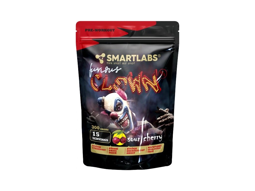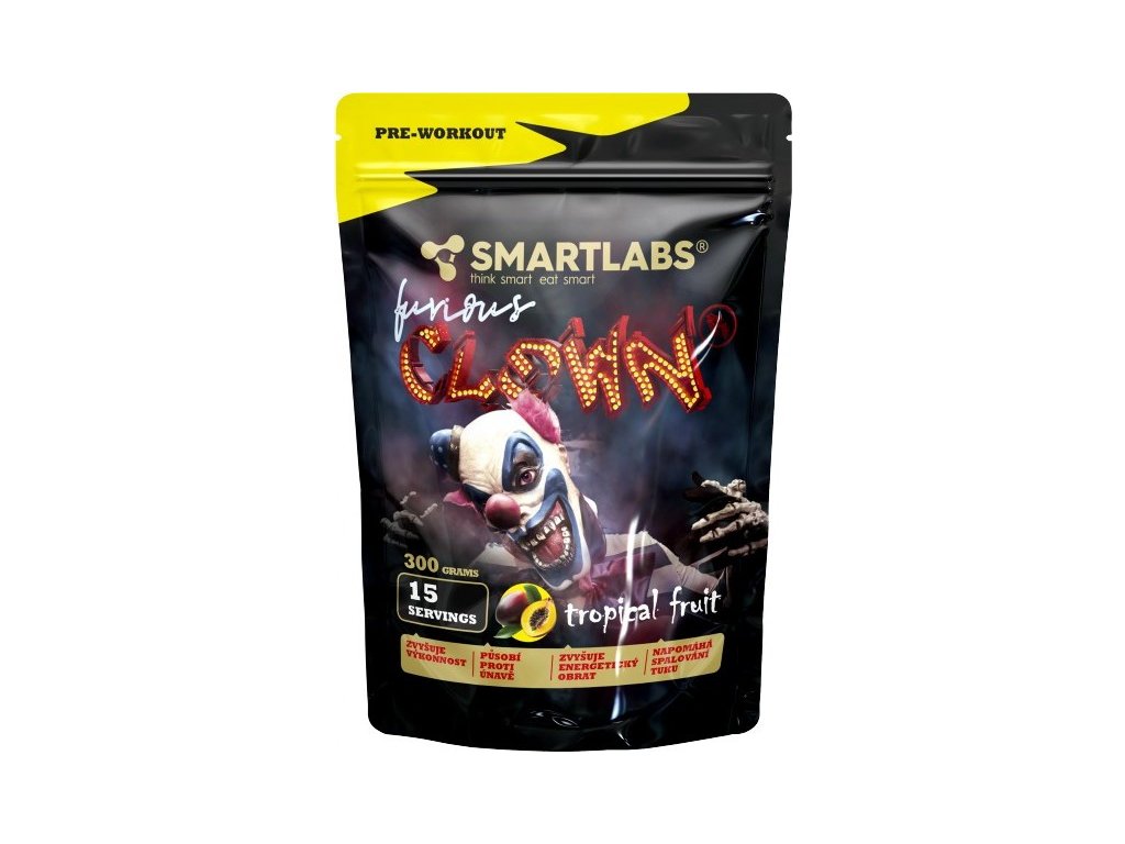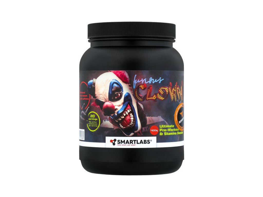 Furious Clown je komplexní předtréninkový doplněk pro všechny, kdo chtějí trénovat tvrdě, naplno a bez kompromisů. Obsahuje účinnou kombinaci látek jako L-citrulin malát, AAKG, beta alanin, taurin, kofein, synefrin a další, které podporují výbušný výkon, soustředění, prokrvení svalů i vytrvalost. Díky vysokému obsahu funkčních látek je vhodný pro náročné silové i vytrvalostní sportovce. Pro maximalizaci výkonu je vhodná kombinace s instantními BCAA na trhu Instant BCAA Triade.