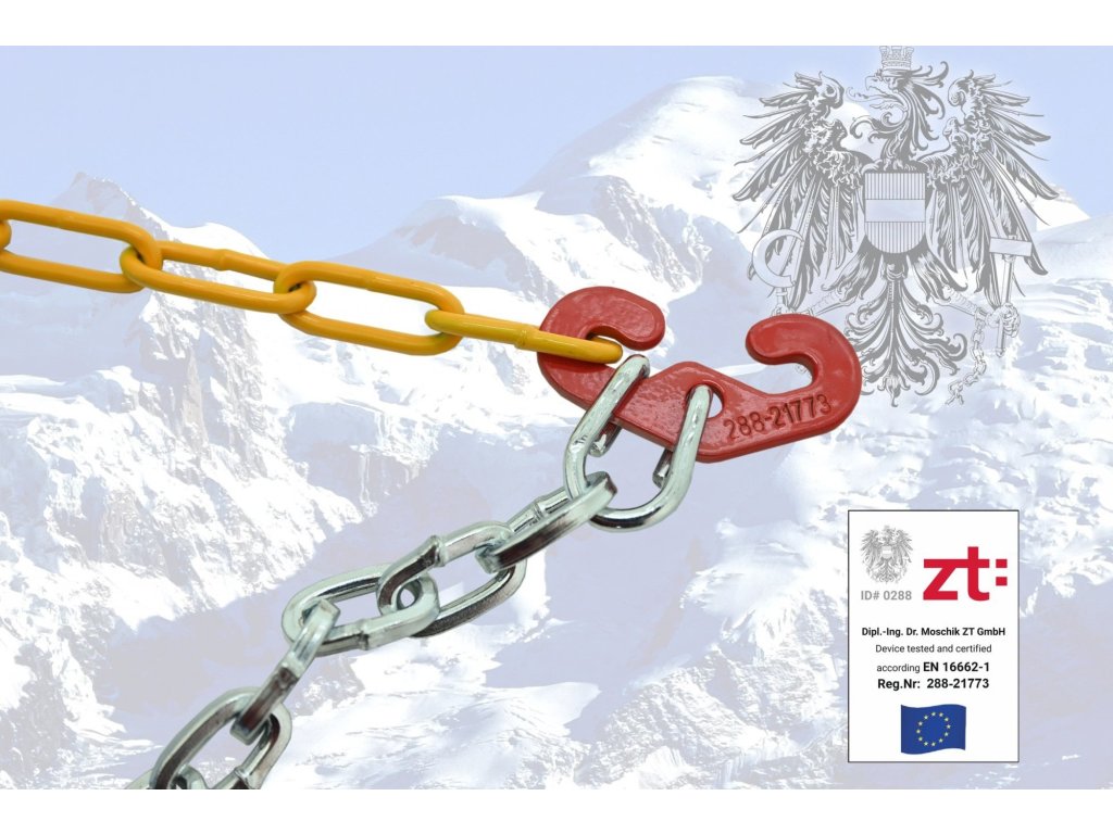 Sněhové řetězy se zesílenými oky, pro osobní vozidla do hmotnosti 2200 kg, splňující evropské normy včetně v Rakousku vyžadované "ÖNORM V 5117".