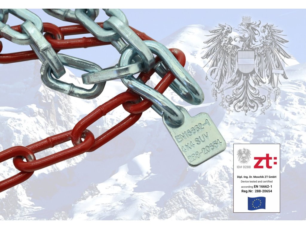 Sněhové řetězy, pro SUV/VAN do hmotnosti 7500 kg, splňující veškeré vyžadované evropské normy. Lze použít i pro dodávky a obytná vozidla.