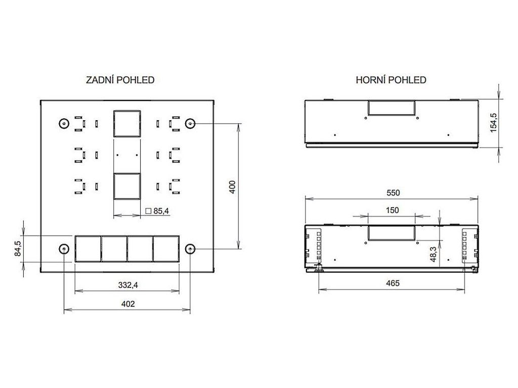 Vstup kabelů je možný předpřipravenými otvory v zádech i ve všech stěnách rozvaděče. V zadní části rozvaděče jsou připraveny otvory pro uchycení na zeď.