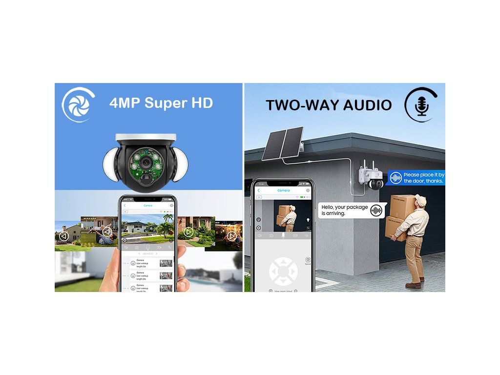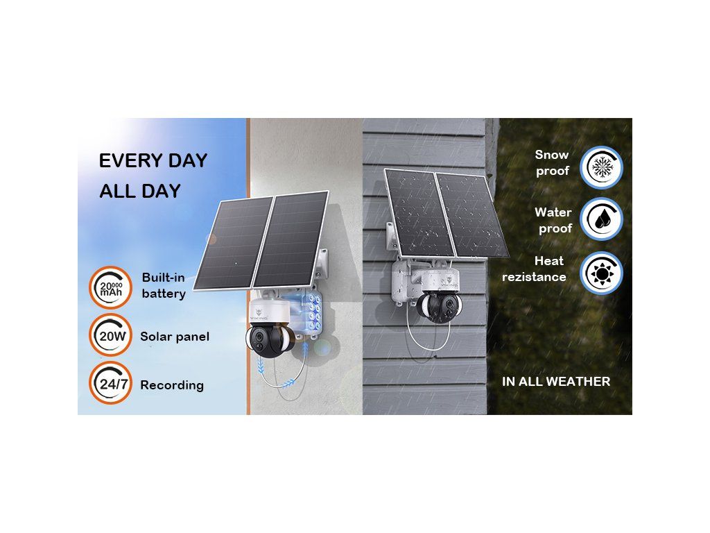 Otočný motorizovaný objektiv · ochrana IP66 · IR i barevné noční vidění až 30m · typ připojení 4G · TF/SD card uložiště · Cloud uložiště · Full HD 1080P rozlišení, výkon solárního panelu 20W max. · kapacita baterie 20000 mAh · PIR funkce · mobilní notifikace · ovládání přes mobilní aplikaci