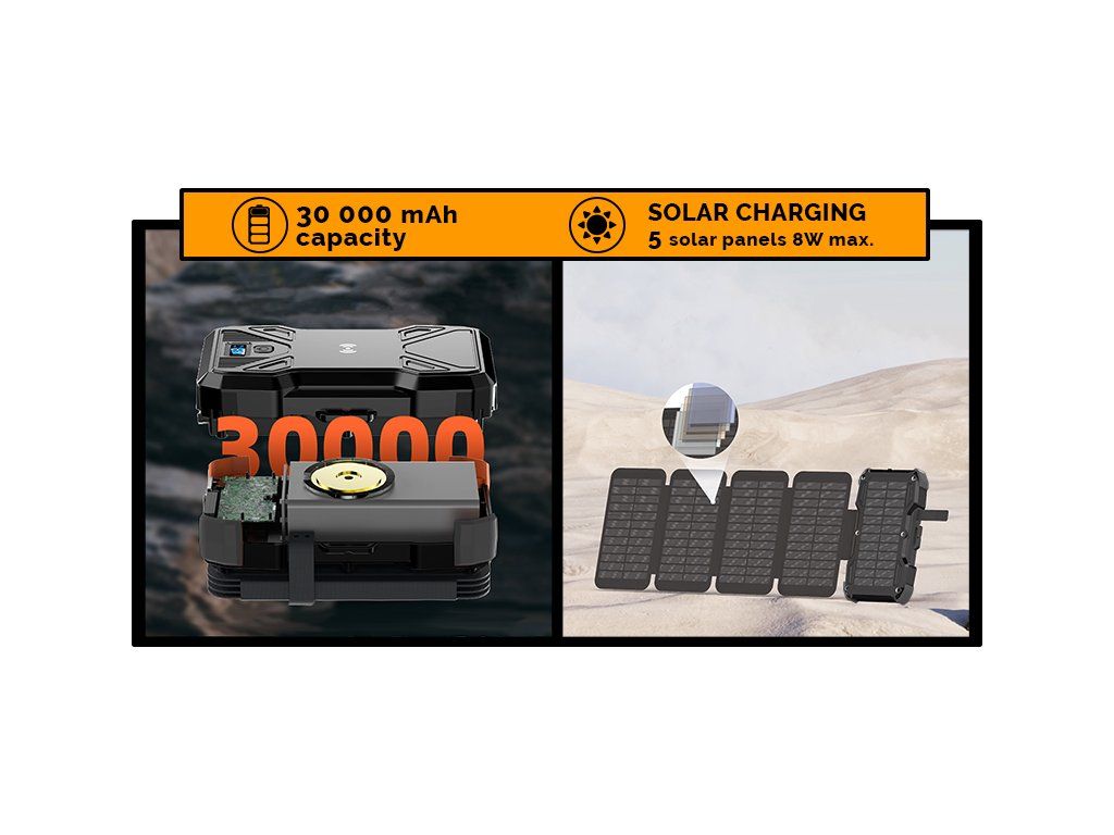Solární powerbanka • Kapacita 30000mAh (111Wh) • podpora rychlonabíjení QC3.0 a Power Delivery • USB-C vstup až PD18W • USB-C výstup (PD20W max.) • 2 x USB-A výstup (QC22.5W max.) bezdrátové wireless nabíjení 15W max. • 5 solárních panelů 8W max • IP54 • LED svítilna