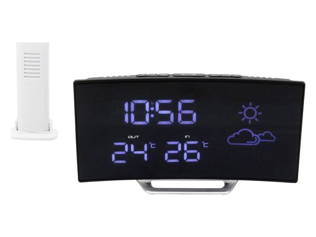 Elegantní radiobudík, kombinující FM rádio, budík a meteostanici. Velký prohnutý displej zobrazuje kromě času i předpověď počasí a aktuální vnitřní i venkovní teplotu. Pro tyto účely je radiobudík vybaven venkovním bezdrátovým čidlem. Samozřejmostí je funkce dvojího budíku, odložení budíku a možnost buzení rádiem nebo alarmem. Rádio navíc nabízí funkci uložení stanic. Čas na budíku se automaticky synchronizuje pomocí radiového pásma DCF-77. Napájení zajišťuje dodávaný napájecí adaptér. Pro případ výpadku proudu lze zařízení napájet pomocí záložní baterie CR2032 (není součástí balení). O napájení venkovního čidla se starají dvě AAA baterie (nejsou součástí balení).