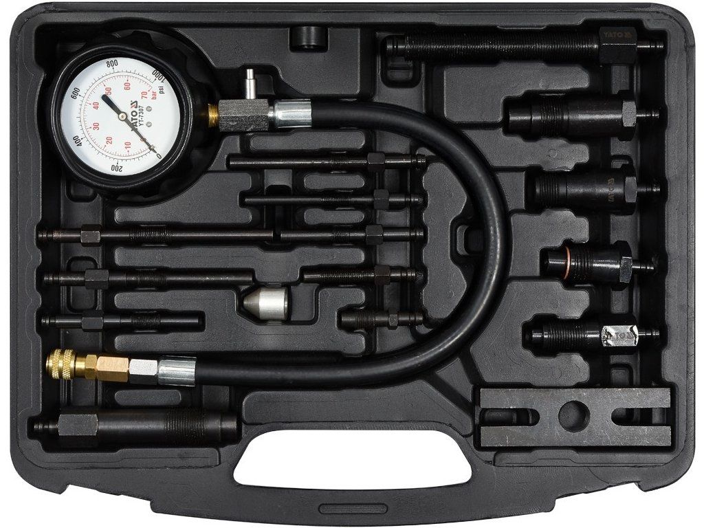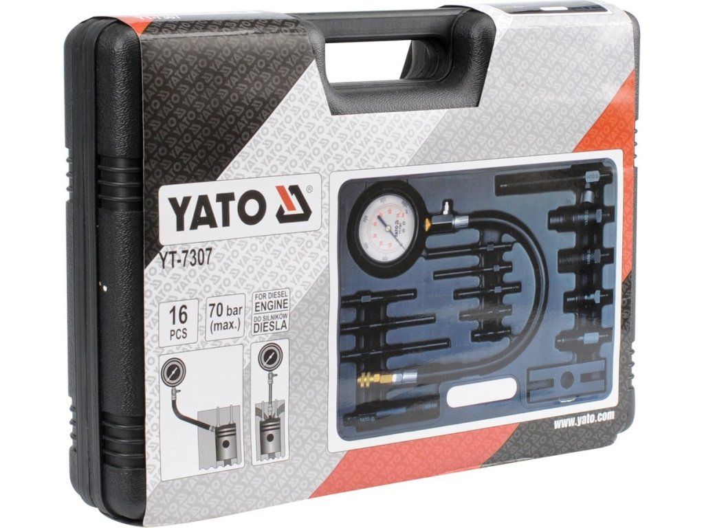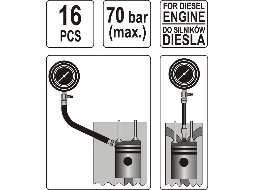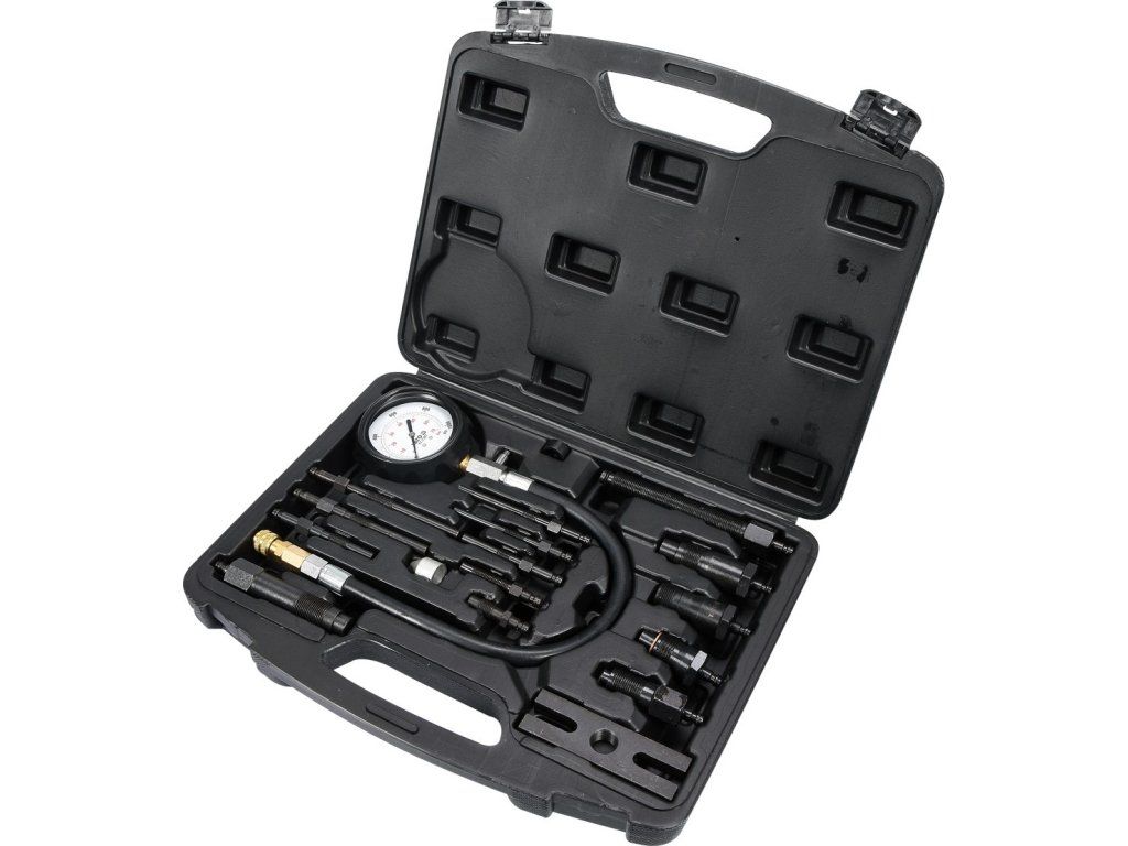 Pro měření komprese Dieselových motorů max 70 bar. Sada obsahuje adaptéry pro připojení měřiče k většině motorů běžných značek automobilů.