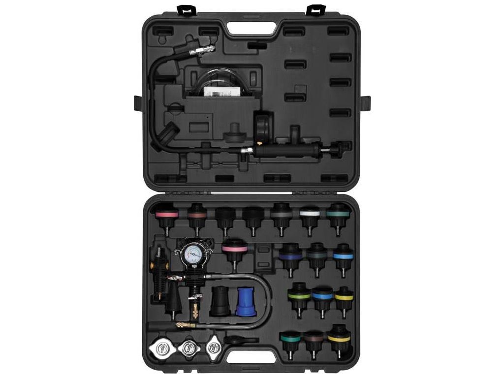 Sada pro testování těsnosti chladiče a pro rychlou výměnu chladicí kapaliny. Barevně odlišené uzávěry usnadňují výběr vhodné testovací zátky. Tester je určen pro autoservisy, diagnostické stanice atp.