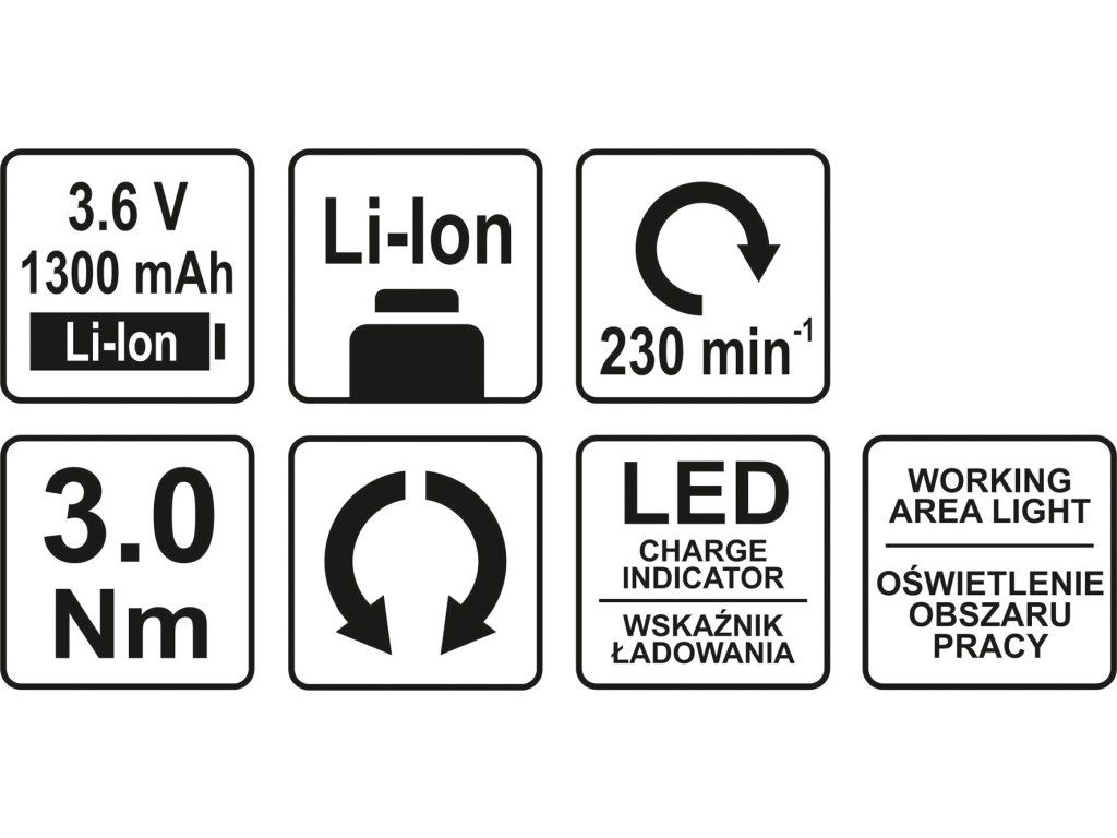 vlastnosti a obsah vestavěná Li-Ion 3,6 V 1,3 Ah baterie a přiložená nabíječka indikátor nabití pro lepší plánování práce přepínač otáčení vpravo / vlevo osvětlení pracovního prostoru pohodlný otočný kloub, který umožňuje změnu polohy rukojeti ergonomicky tvarovaná protiskluzová rukojeť včetně dvou nejoblíbenějších šroubovacích bitů: plochý a křížovýDoplňkové parametry
