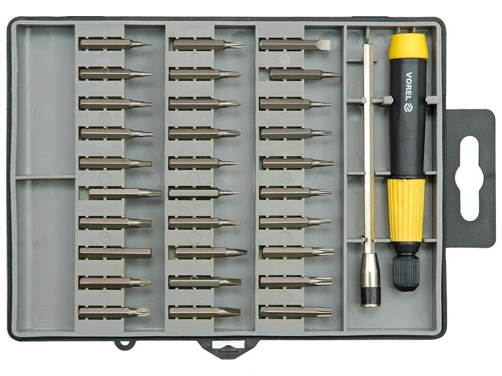 Praktická hodinářská sada bitů, šroubováku a nástavce.