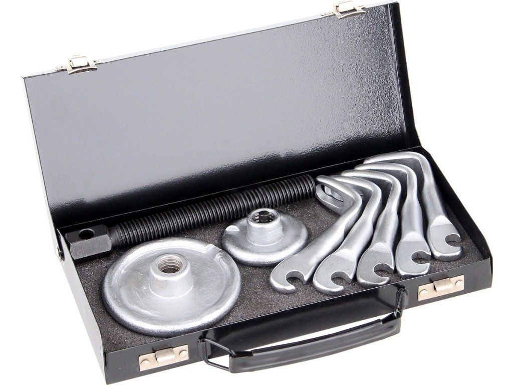 Veškeré příslušenství, zhotovené z kvalitní CrV oceli, je přehledně uloženo v kovovém kufru.