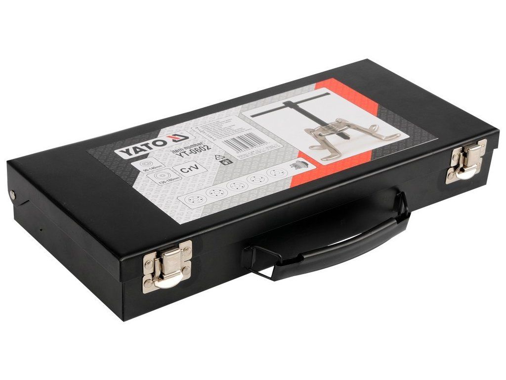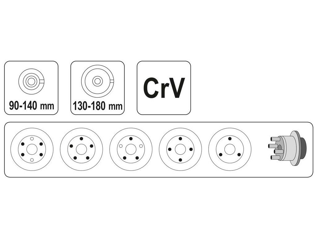 Sada obsahuje 5 kusů ramen, kruhový přípravek pro průměr 90 - 140 mm, kruhový přípravek pro průměr 130 - 180 mm a stahovací šroub s T rukojetí.