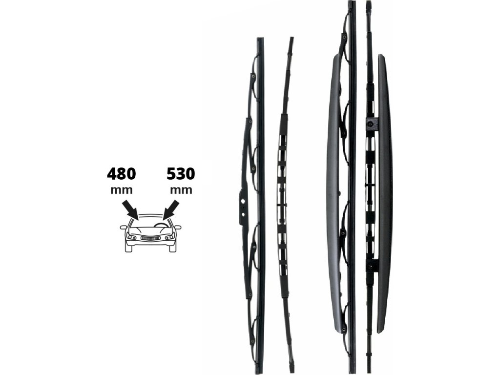Sada dvou stěračů (řidič + spolujezdec) rozdílných délek, optimalizovaná pro nejběžněji používanou kombinaci velikostí stěračů. Stěrač určený k montáži před řidičem se spoilerem. Stěrač určený k montáži před spolujezdcem je prohnutý. Zajišťuje dokonalé stírání i na zakřivené části skla na straně spolujezdce. Kvalitní vícevahadlová nýtovaná konstrukce ramena stěrače. Balení obsahuje stěrač 530 mm (21") + stěrač 480 mm (19") + univerzální adaptéry pro montáž.