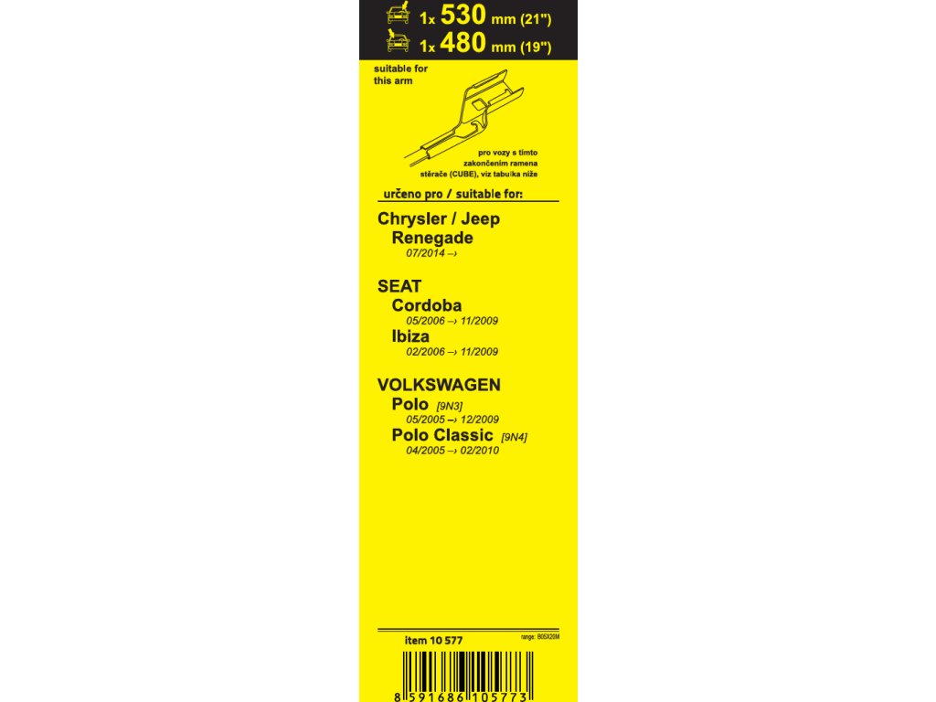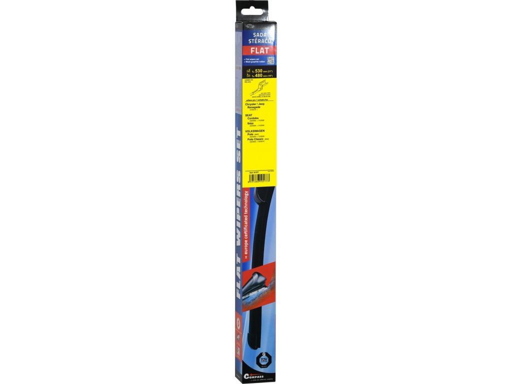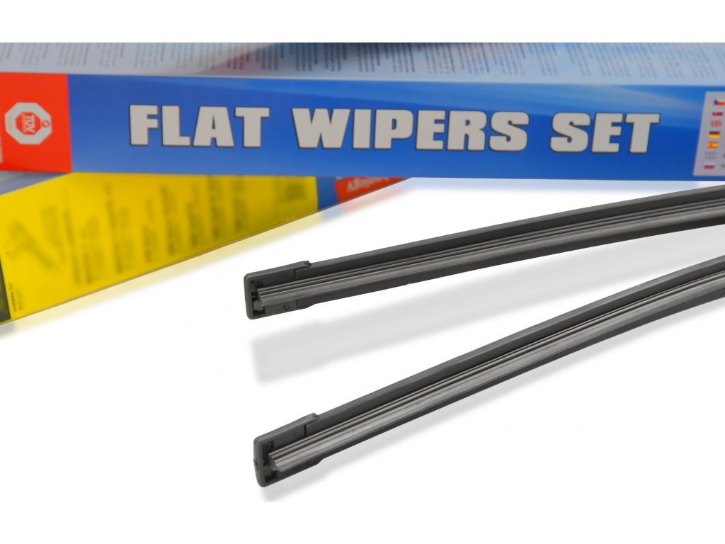 Sada dvou plochých stěračů FLAT (řidič + spolujezdec) se speciálním uchycením. Délky stěračů a systém uchycení na ramínko jsou přizpůsobeny vybraným vozům (viz tabulka použití).