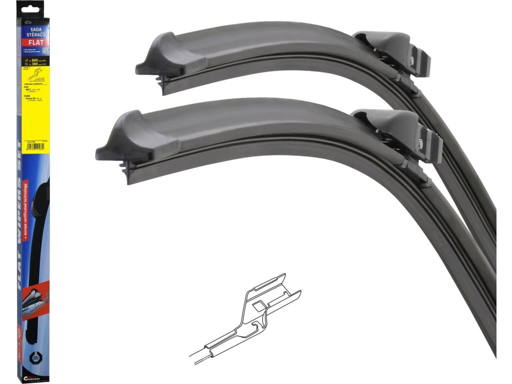 Sada dvou plochých stěračů FLAT (řidič + spolujezdec) se speciálním uchycením. Délky stěračů a systém uchycení na ramínko jsou přizpůsobeny vybraným vozům (viz tabulka použití).