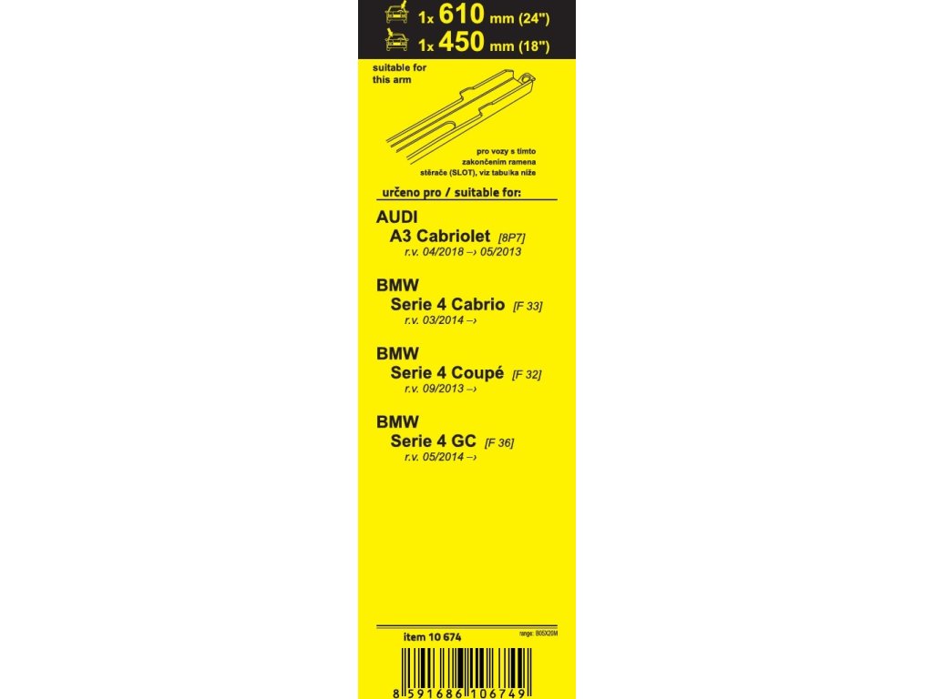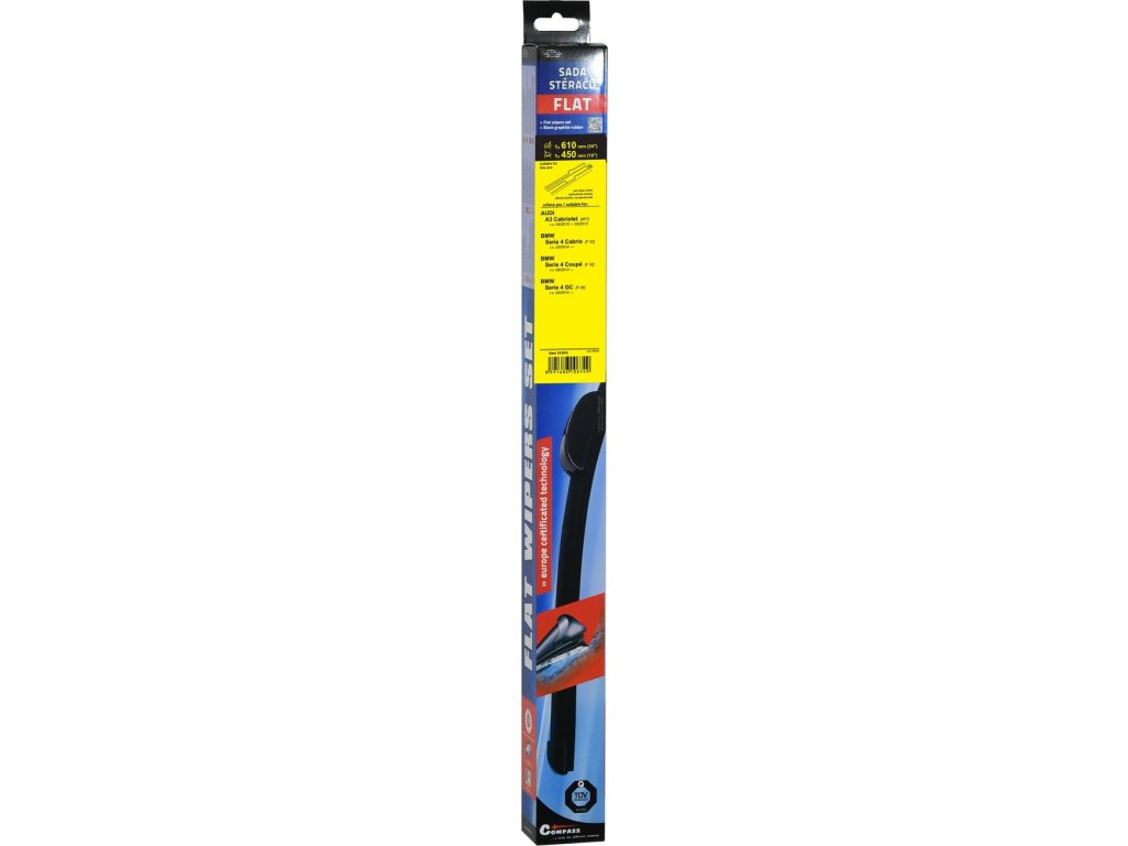 Sada dvou plochých stěračů FLAT (řidič + spolujezdec) se speciálním uchycením. Délky stěračů a systém uchycení na ramínko jsou přizpůsobeny vybraným vozům (viz tabulka použití).
